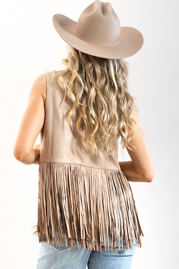 Layer on western charm with this brown faux suede fringe vest. The open front and soft suede give it an easy drape, while the fringe adds movement and personality. This layering piece is perfect for festivals, nights out or elevating a simple jeans-and-tee look.