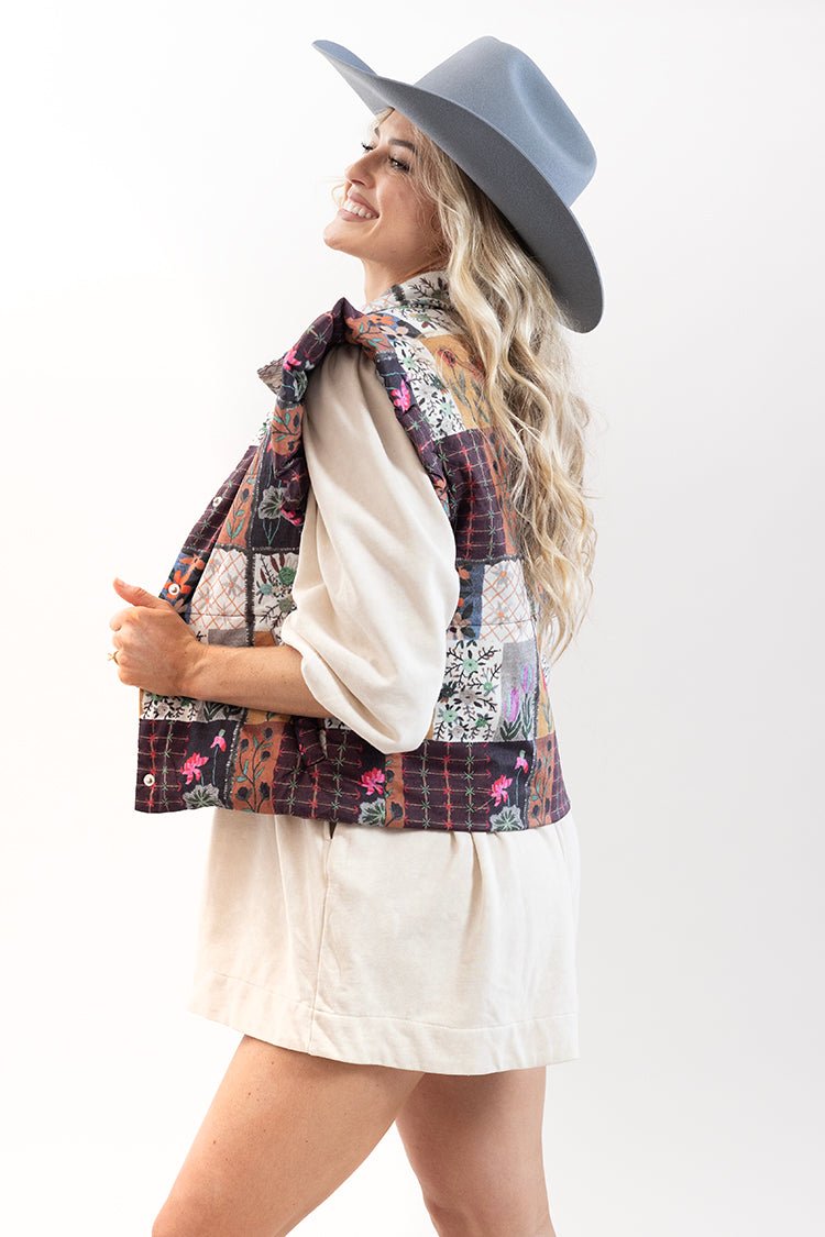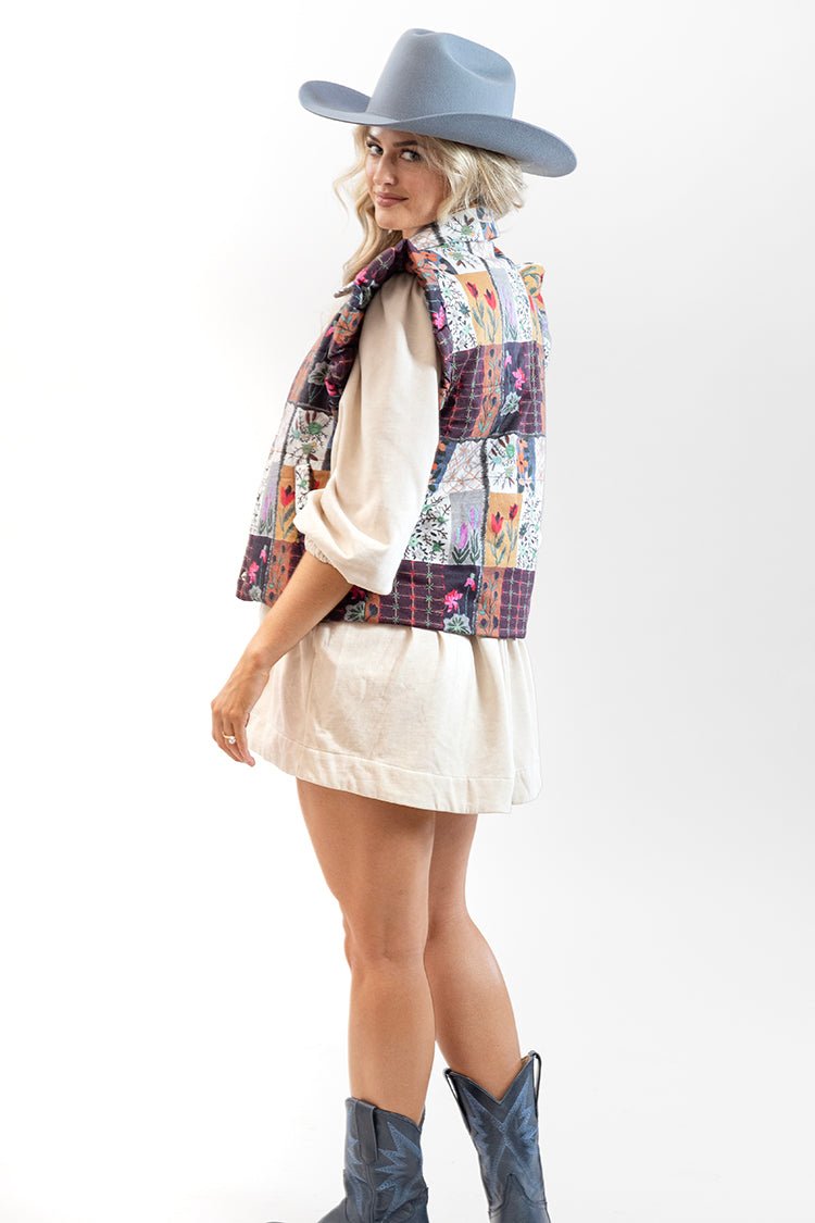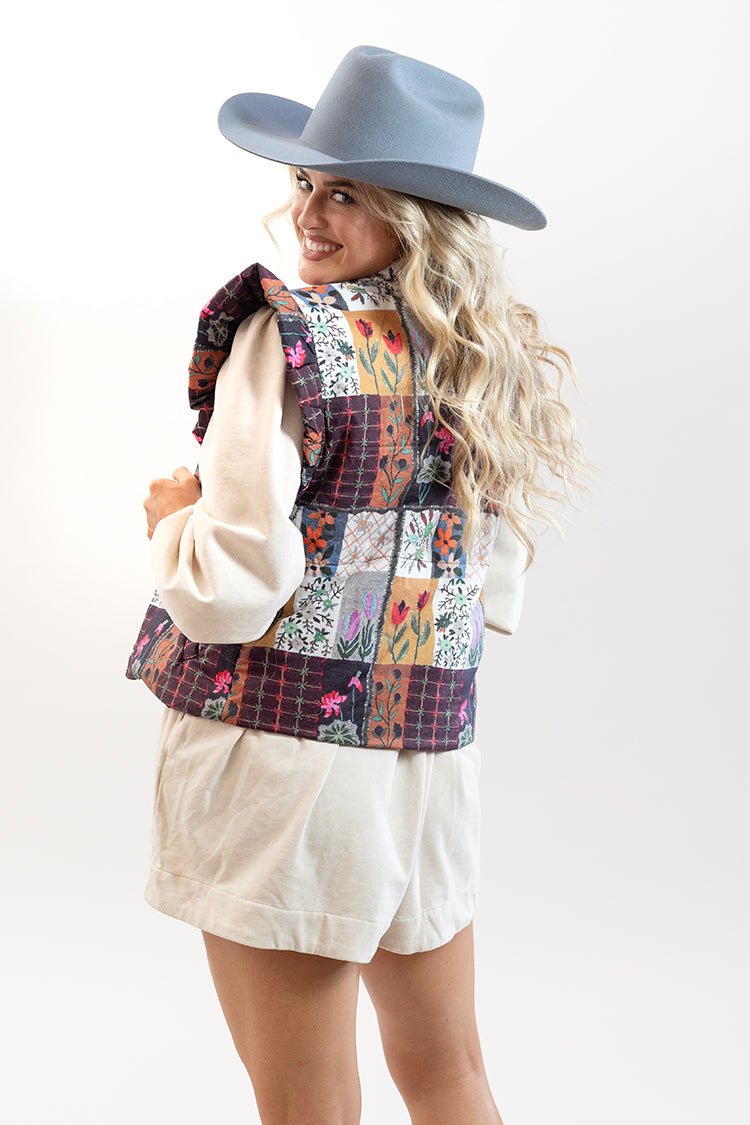 This floral puffer vest features bold patchwork prints and romantic ruffle detail at the shoulders. A great layering piece with a front button closure, it delivers warmth without sacrificing style. Perfect for chilly days, this cozy vest adds a flirty touch to any outfit.