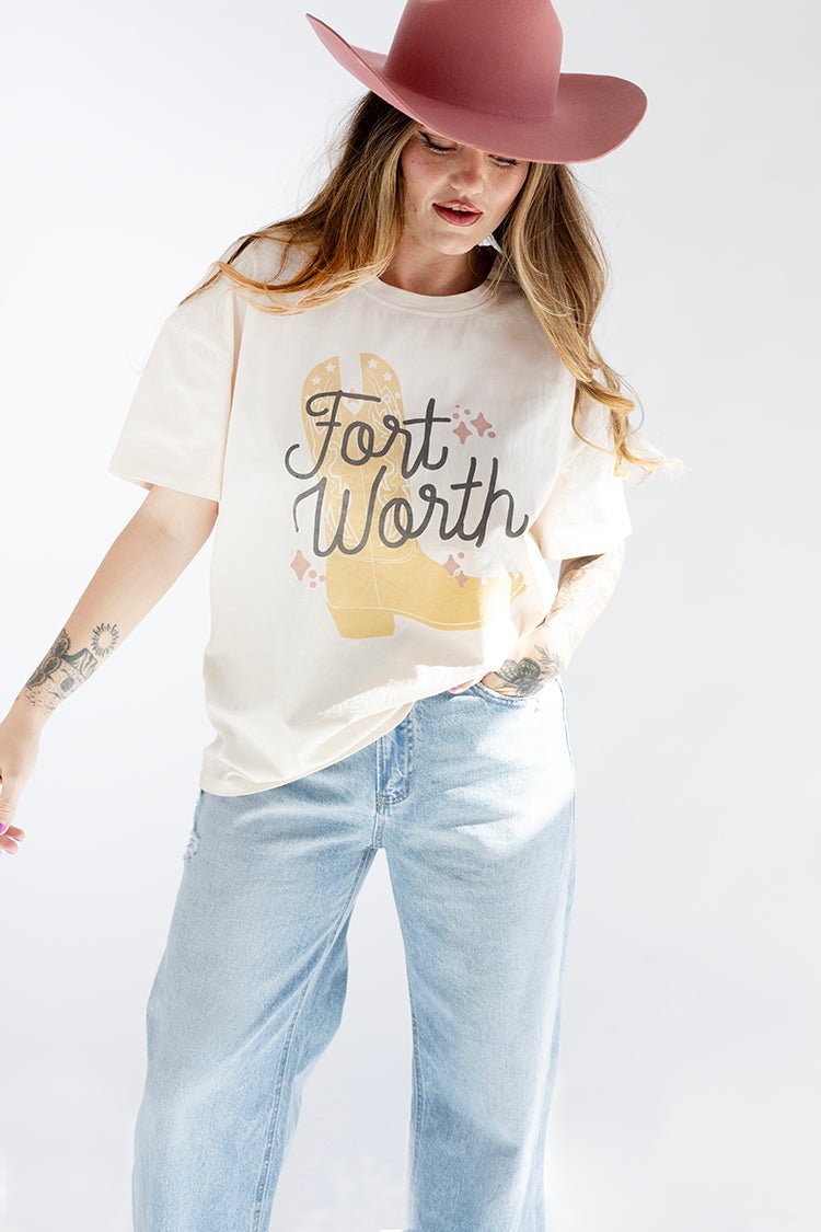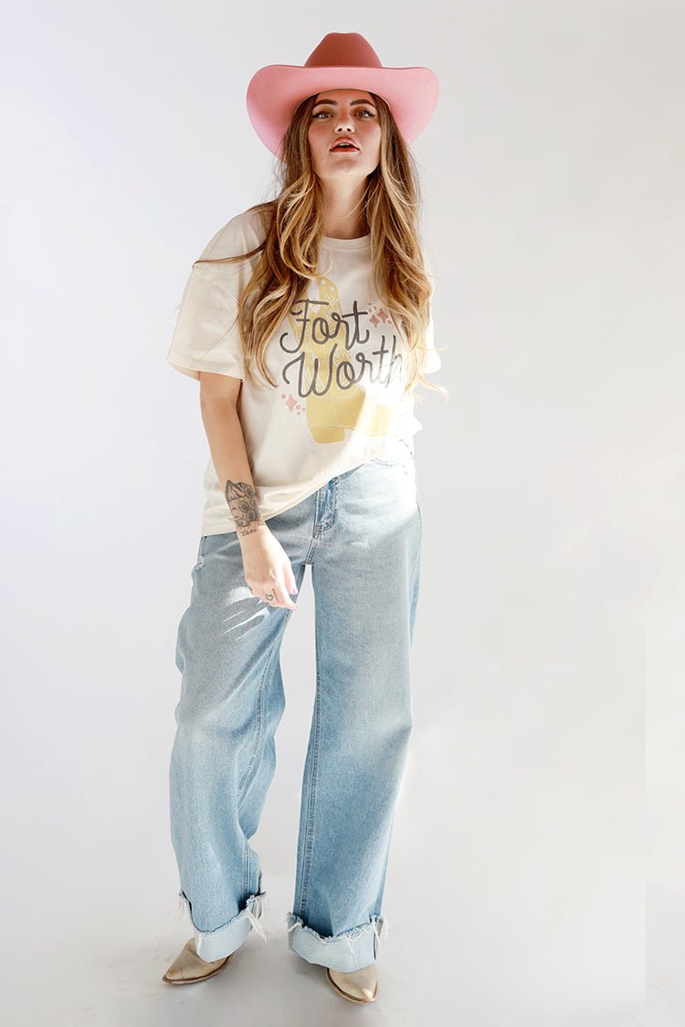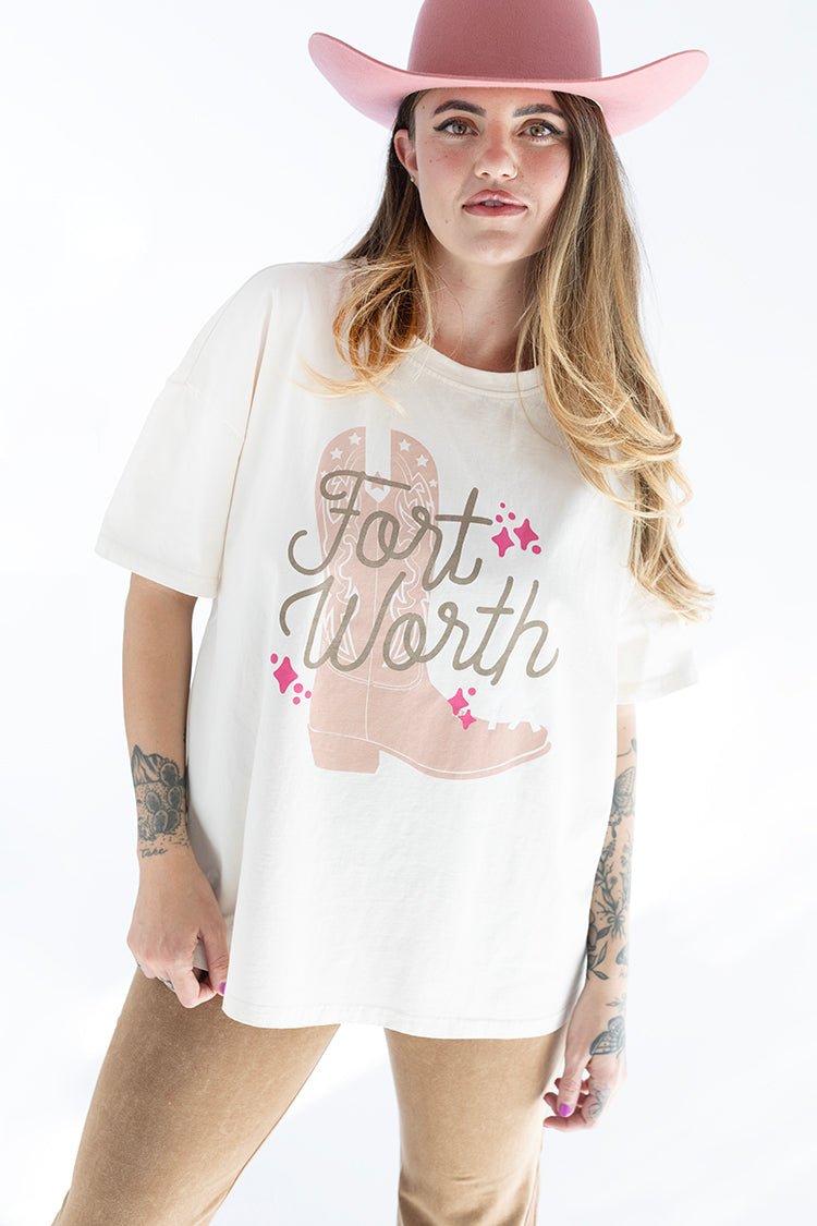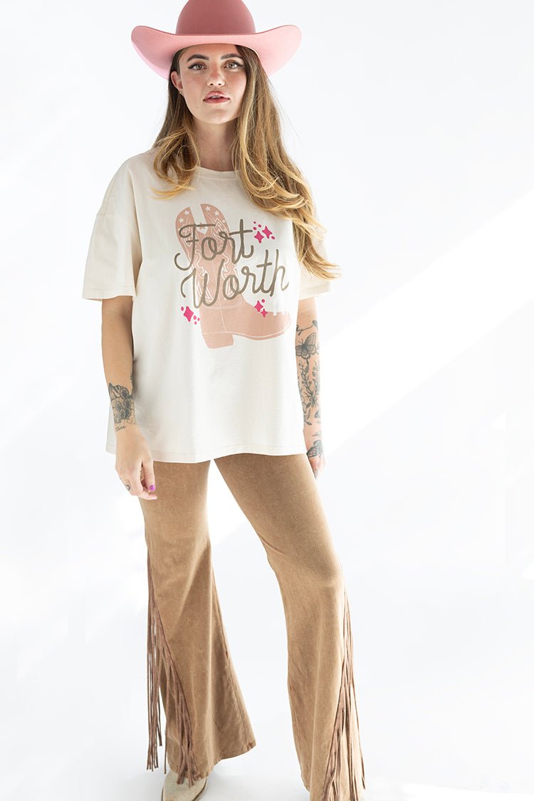 Fort Worth on your mind? This Flea Style exclusive oversized tee is for the Cowtown fans out there! We adore the bold boot and script deign in soft, flattering hues. Pair with our flare pants or endless denim options for an easy, stylish look.