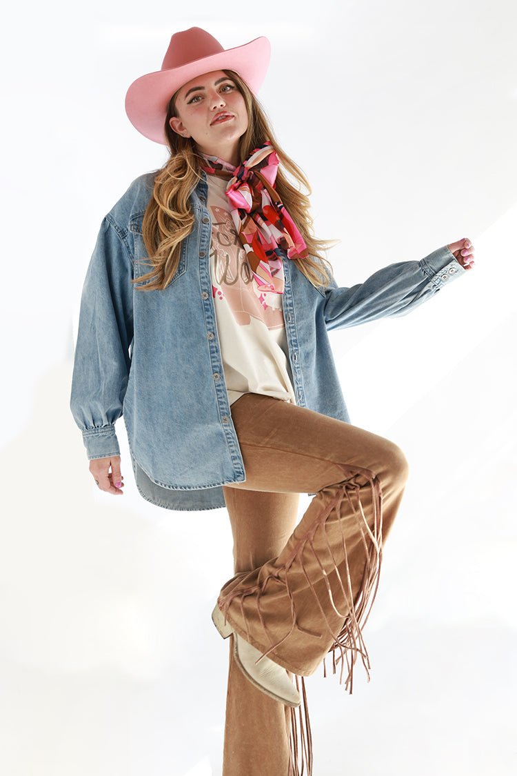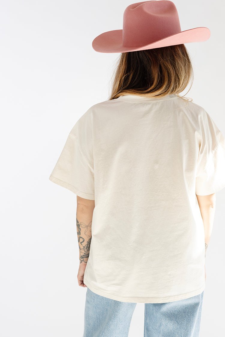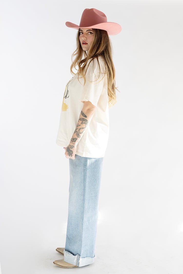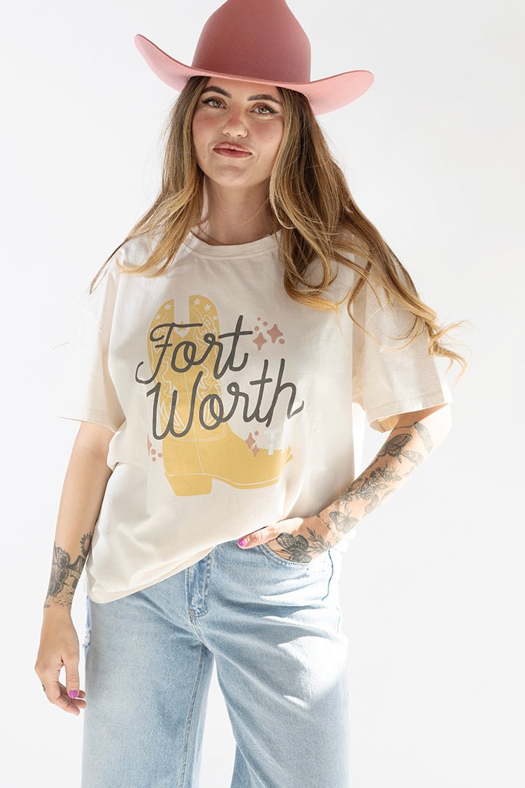 Fort Worth on your mind? This Flea Style exclusive oversized tee is for the Cowtown fans out there! We adore the bold boot and script deign in soft, flattering hues. Pair with our flare pants or endless denim options for an easy, stylish look.