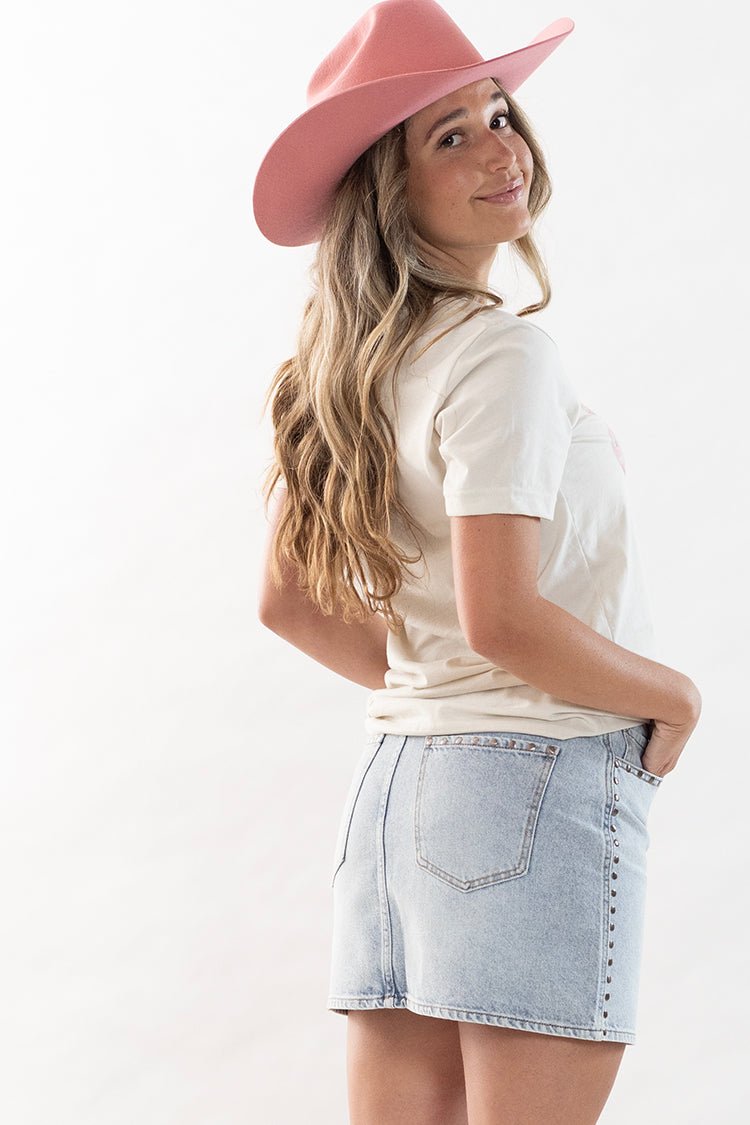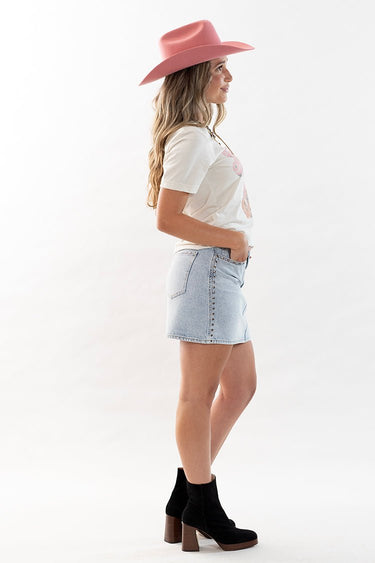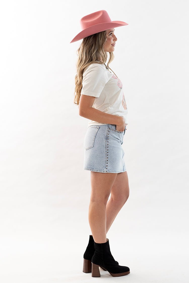 This light wash, denim, mini skirt is easy to fold into your weekly wardrobe. Little studded details and a flattering fit make this classic staple perfect for casual days, concert nights, and everything in between.