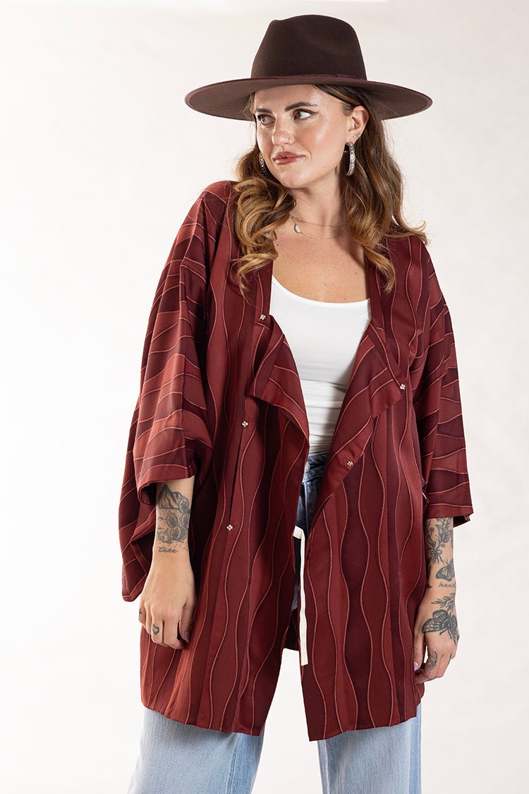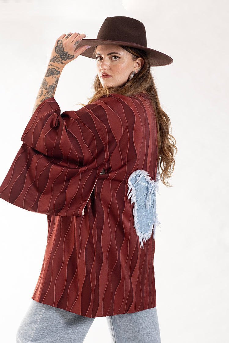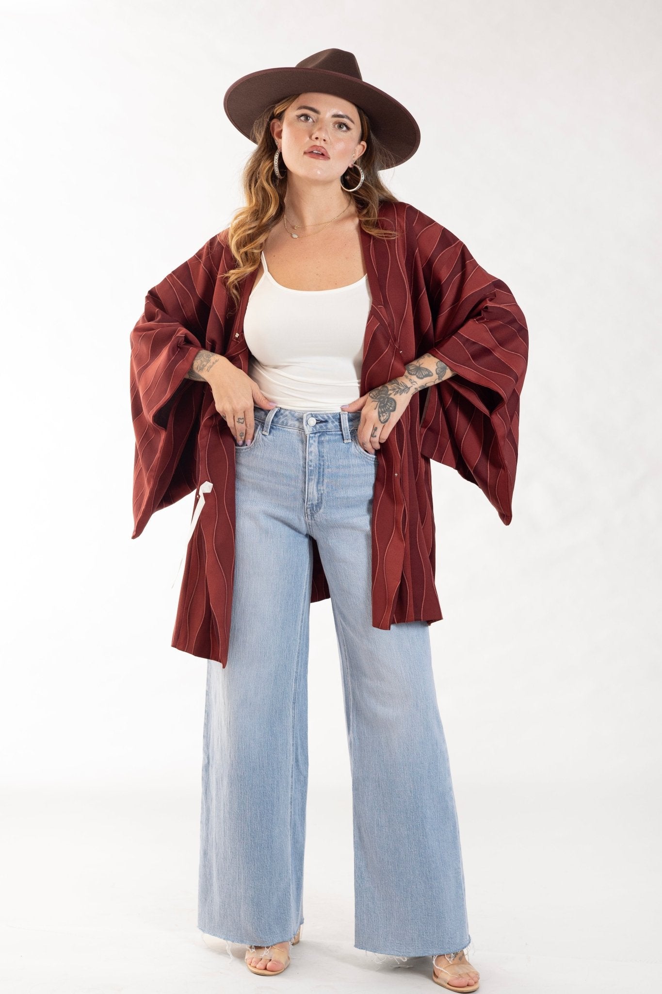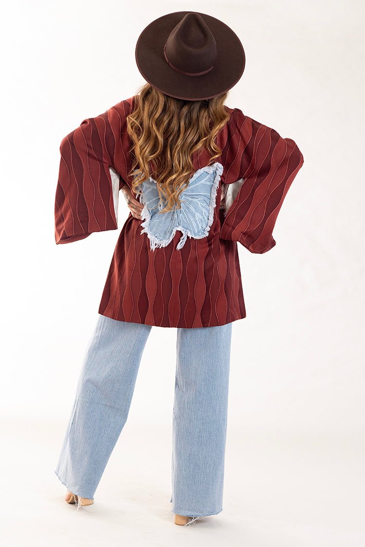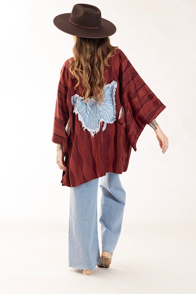 We hand-curate our vintage kimonos from California flea markets with love and care. We added a denim butterfly to this maroon abstract print style for extra flair. Exclusive to Flea Style and available online-only, this breezy layering piece is a unique treasure that adds artistry and personality to your wardrobe.