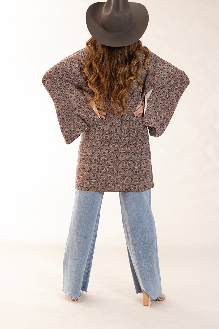 We sourced this vintage Michiyuki jacket in California, and it’s a true treasure. Known for its square collar, flattering three-quarter length and kimono-style sleeves, this traditional Japanese piece is versatile enough to wear buttoned up as a dress or open over a tee and jeans as a one-of-a-kind layer. Exclusive to Flea Style and available online only, it brings timeless craftsmanship and unique style to your wardrobe.