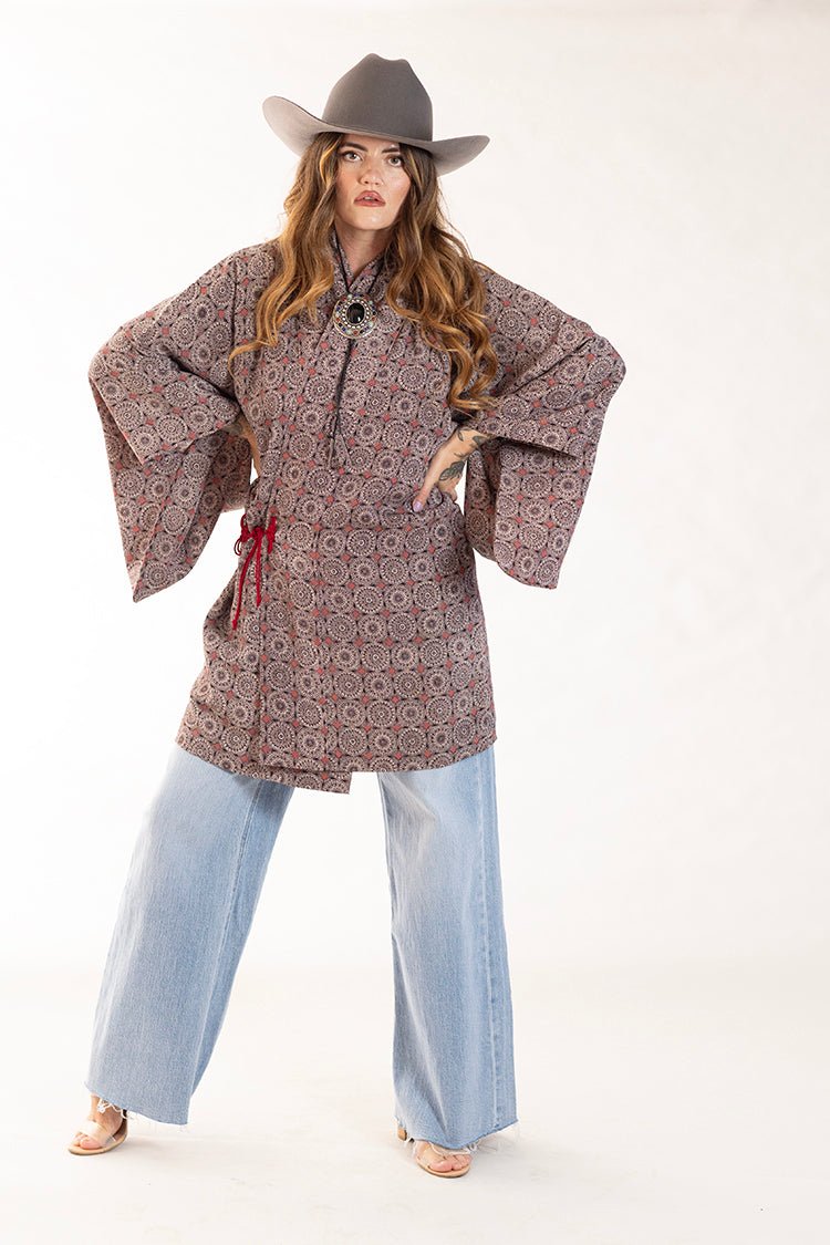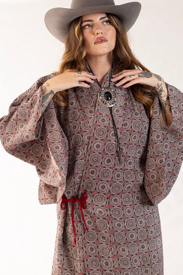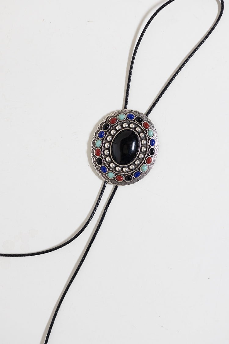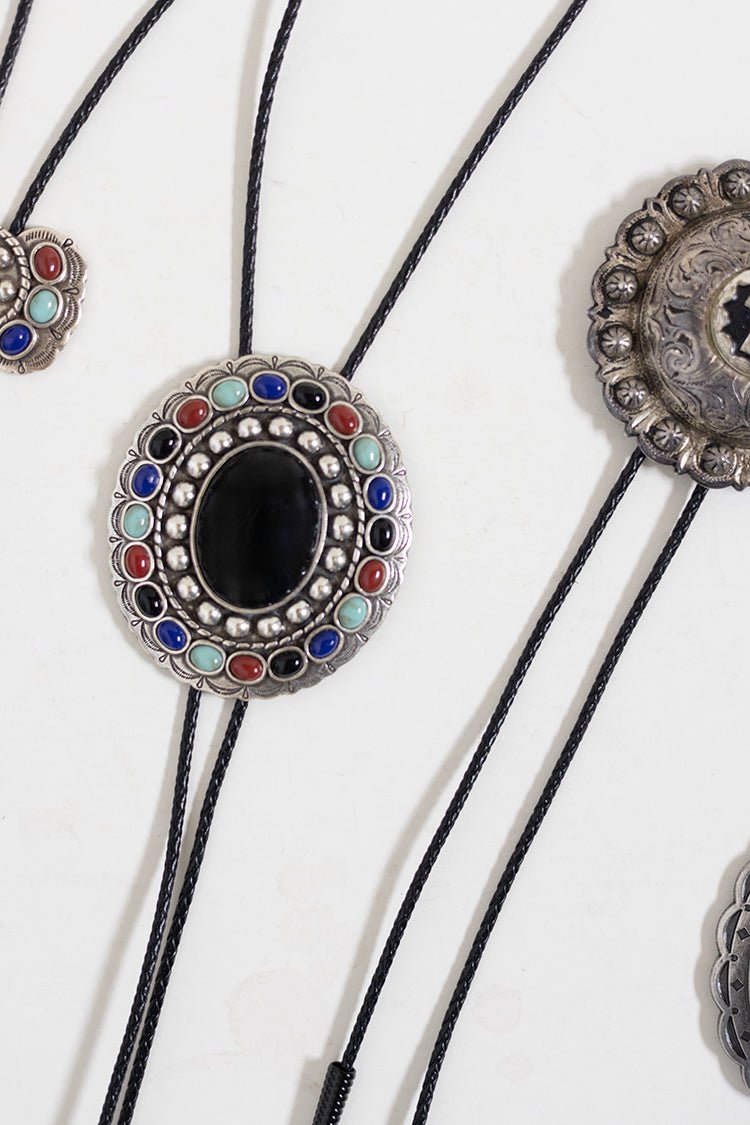 This oval western stone bolo tie is classic and cool. Handmade in our Dallas design studio and exclusive to Flea Style, this online-only piece features a vintage silver medallion with a bold black oval stone at the center, framed by colorful turquoise, red and blue cabochons. Finished with a braided black cord, it’s a versatile statement accessory that delivers all the cowgirl vibes.