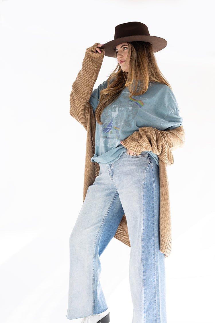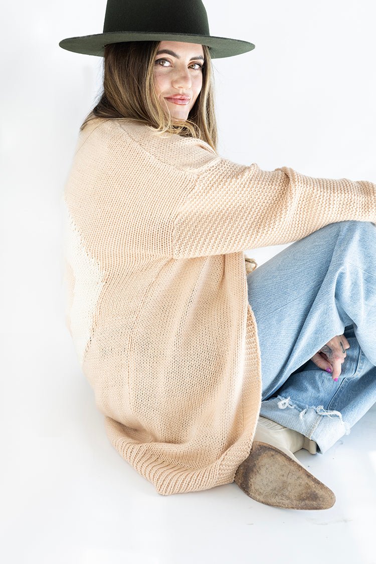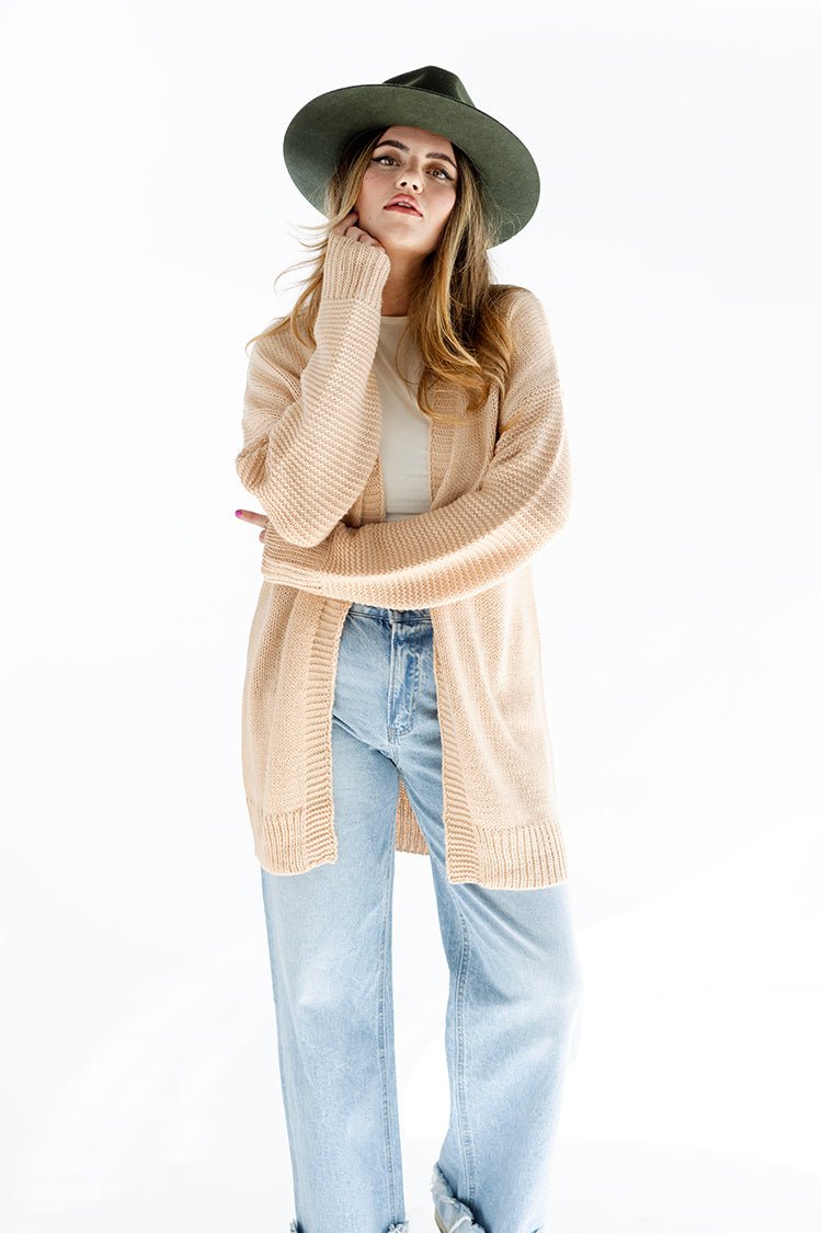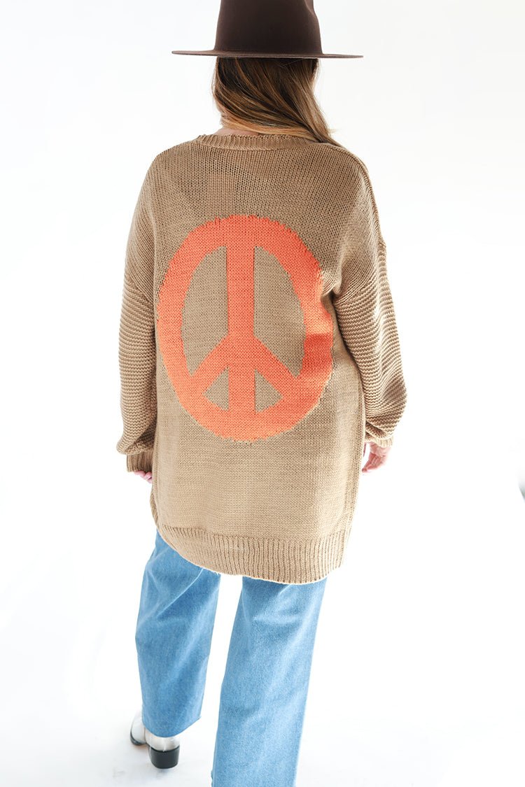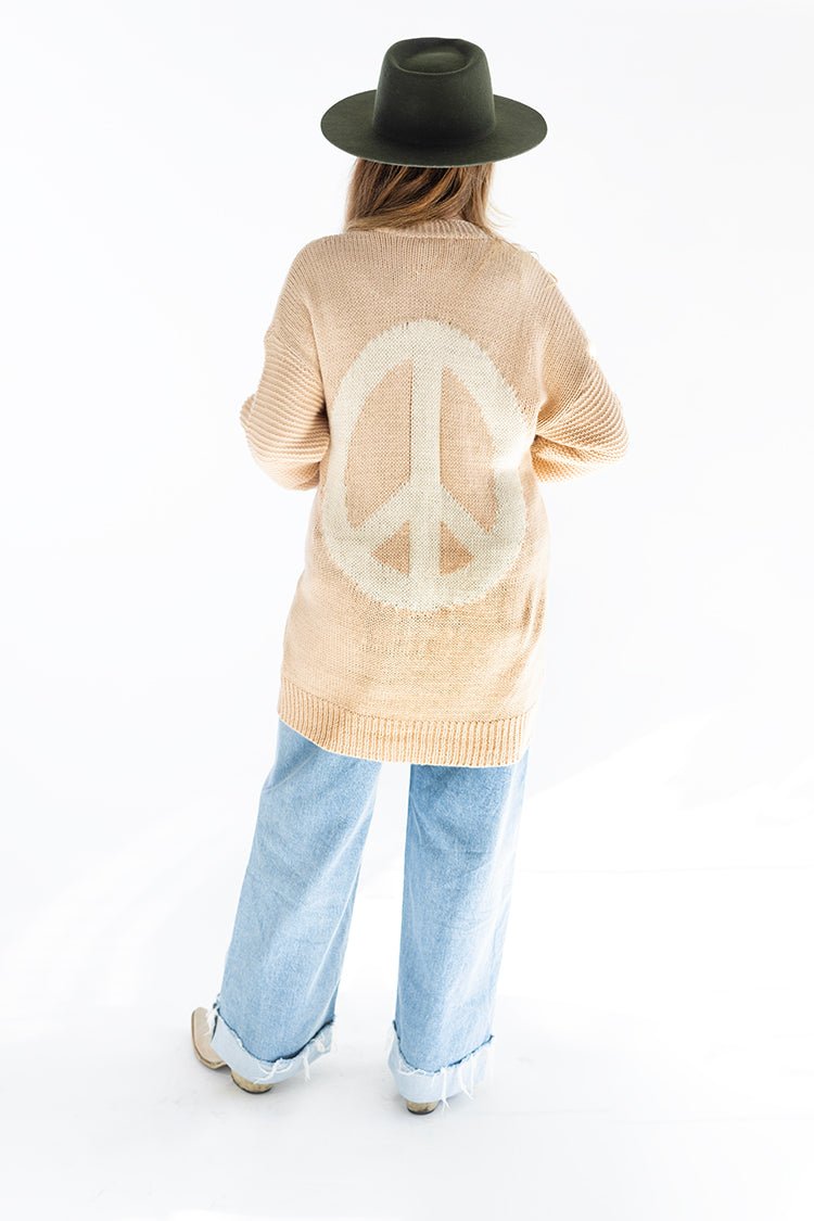 This sweater promises to spread peace, love and joy! Available in beige and taupe options, this neutral open cardigan is easy to layer over solid or graphic tees and tanks.