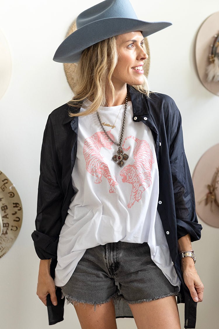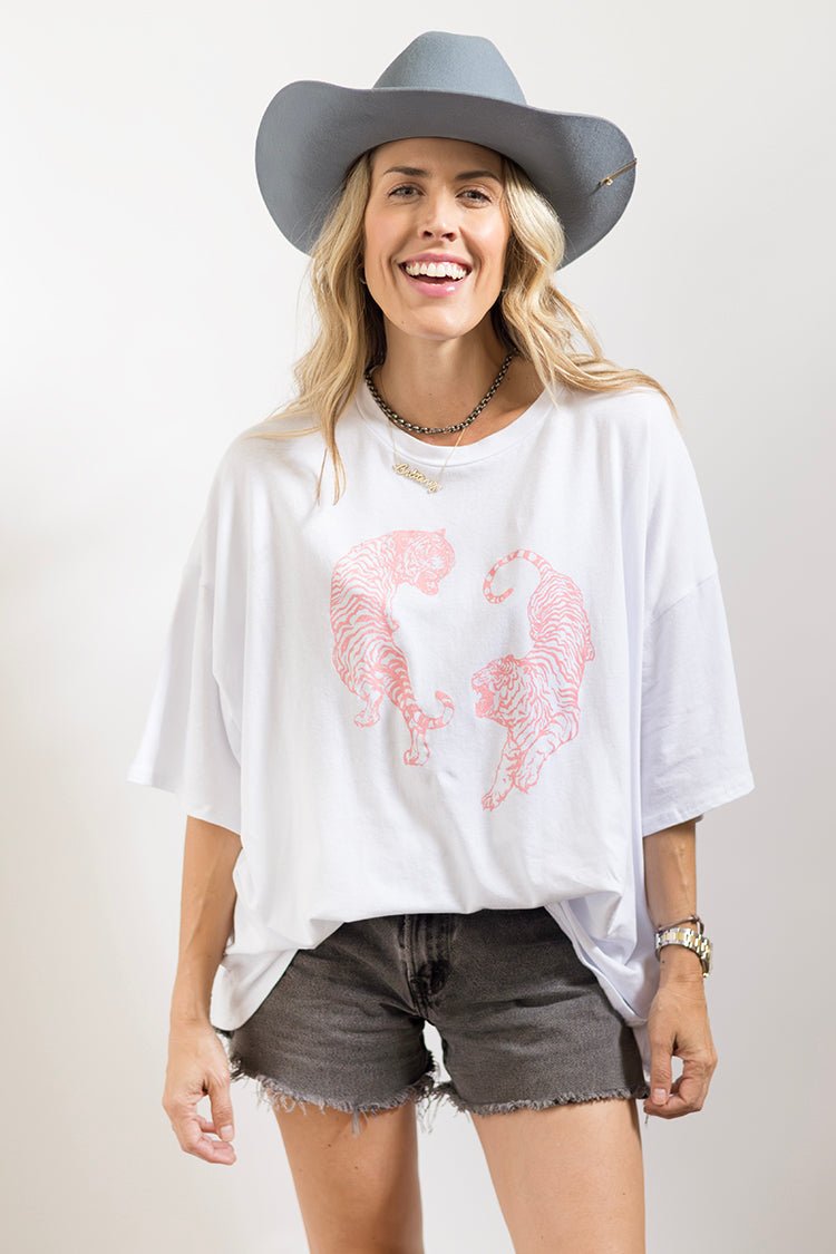 Elevate your casual wardrobe with the Pink Tiger Oversized Tee, a perfect blend of bold style and ultimate comfort. This eye-catching tee features a vibrant bubblegum pink color that instantly draws attention, complemented by a striking tiger graphic on the chest. The fierce tiger design, rendered in bold vintage-inspired tones, adds an edgy, artistic touch to your everyday look.
