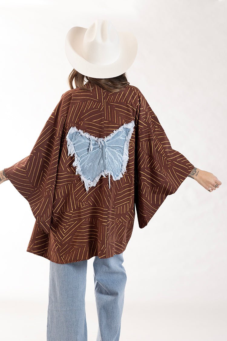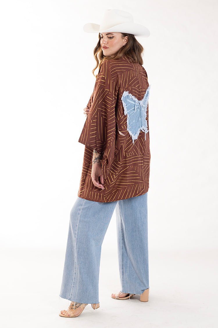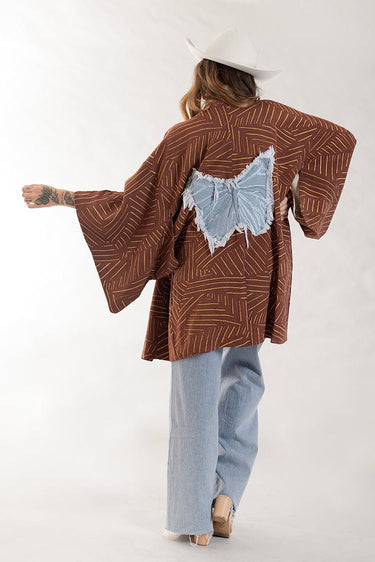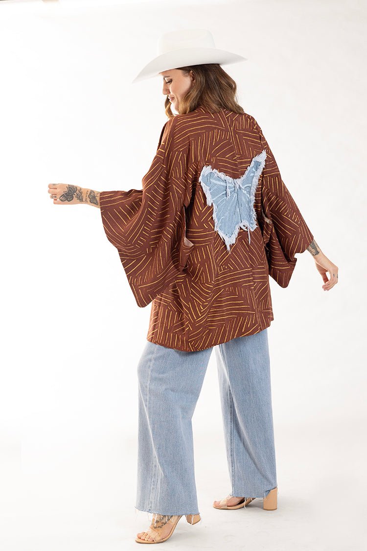Rust and Gold Printed Kimono with Denim Butterfly