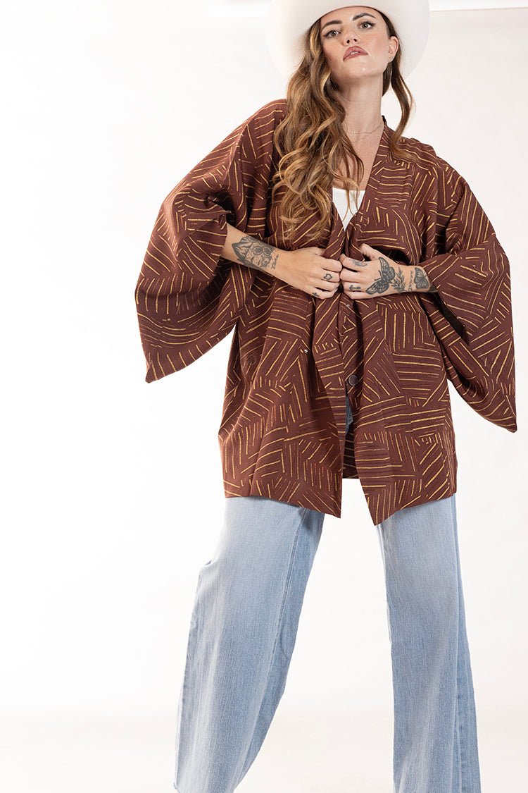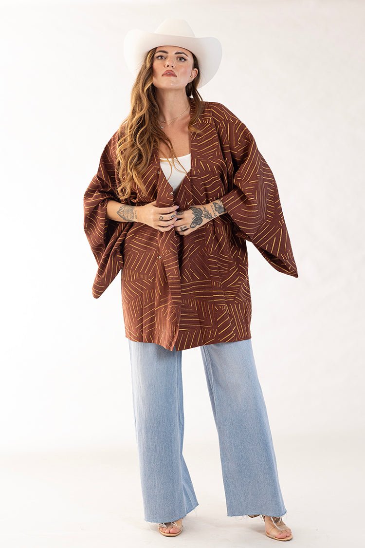 We hand-curate our vintage kimonos from California flea markets with love and care. We added a denim butterfly to this rust and gold printed style for extra flair. Exclusive to Flea Style and available online-only, this breezy layering piece is a unique treasure that adds artistry and personality to your wardrobe.