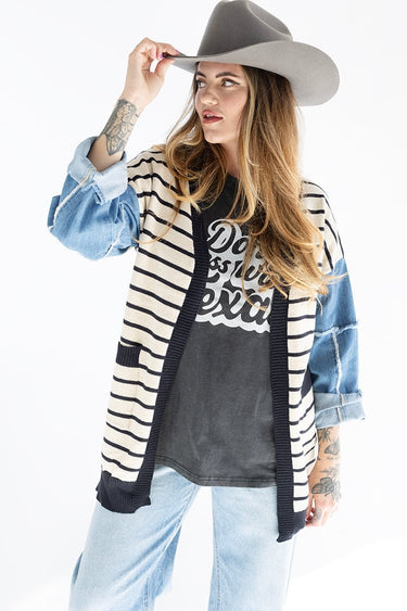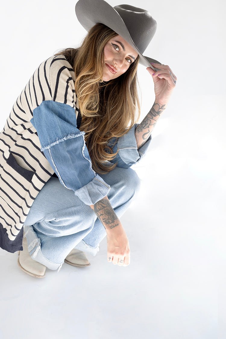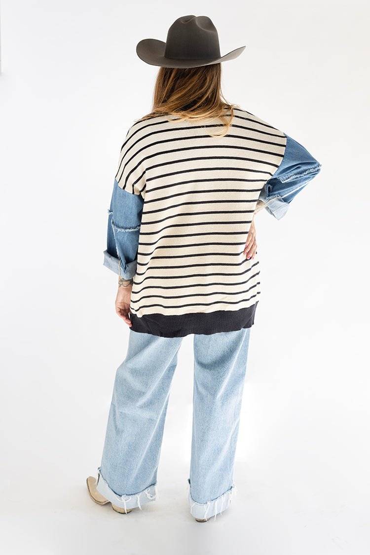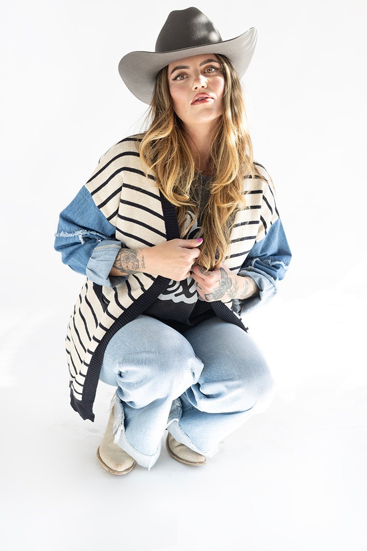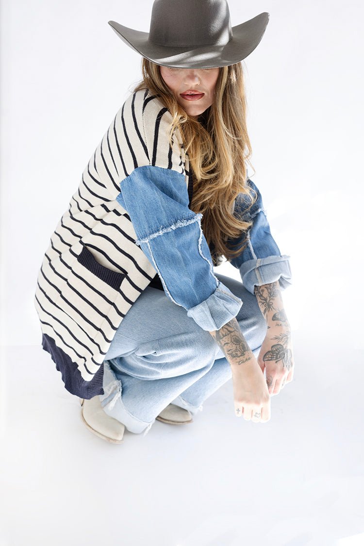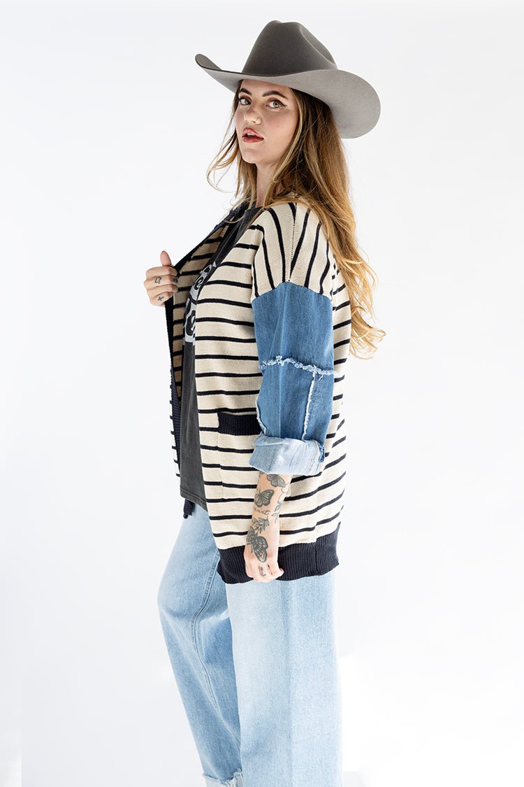 Striped Cardigan with Denim Sleeve Detail - Flea Style