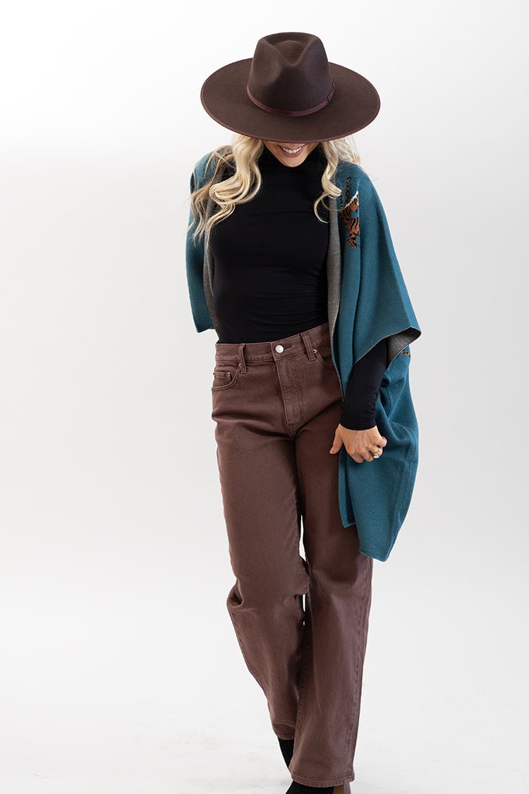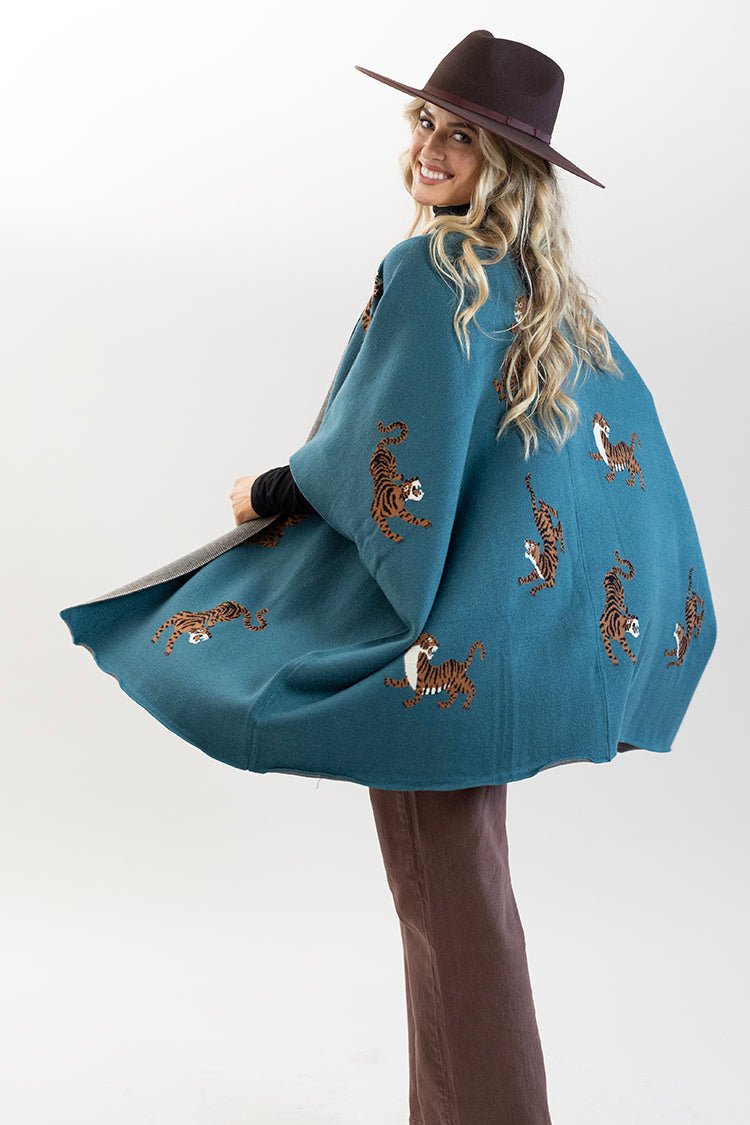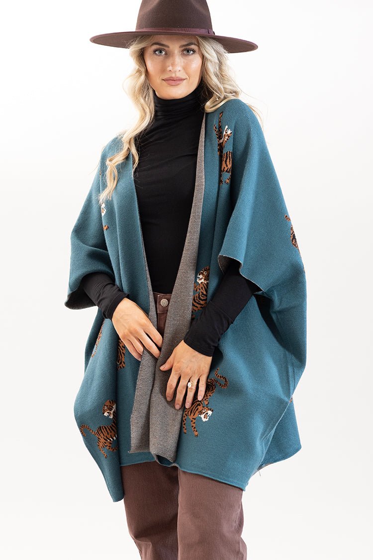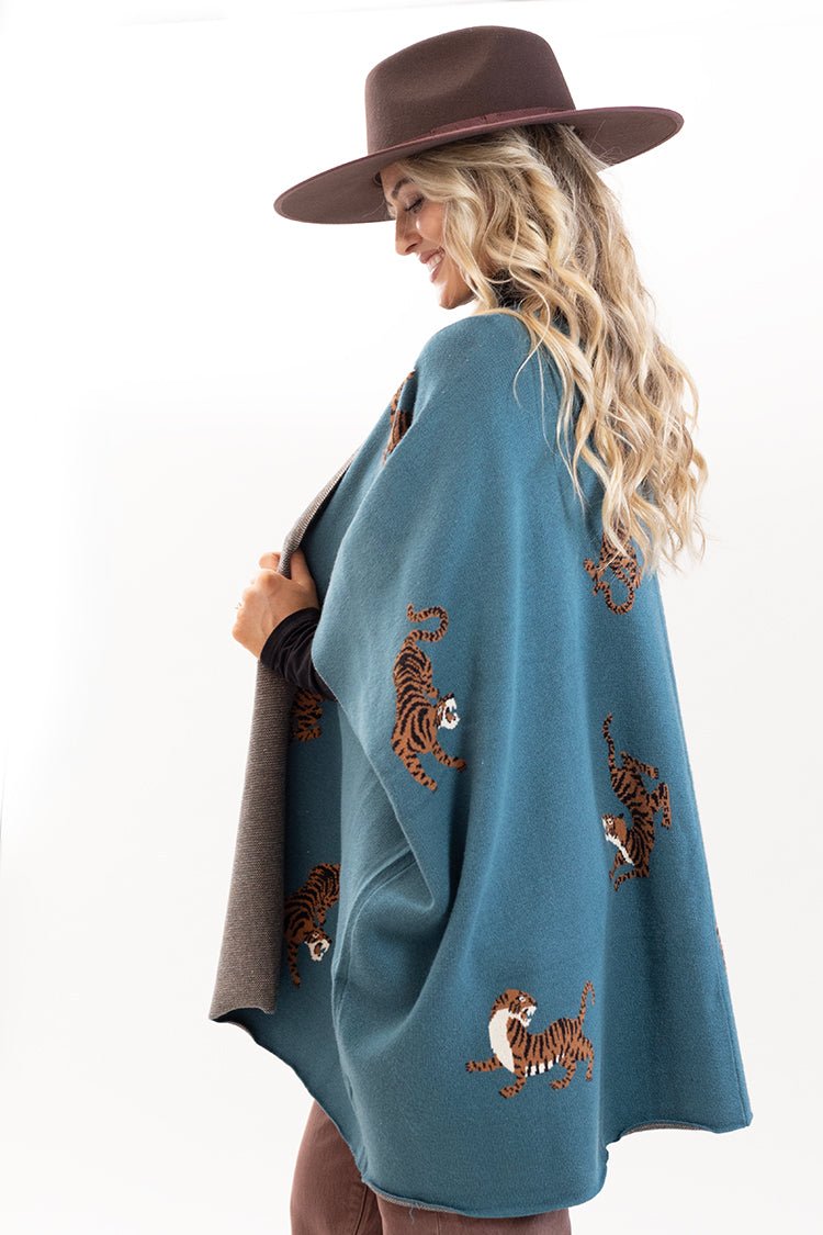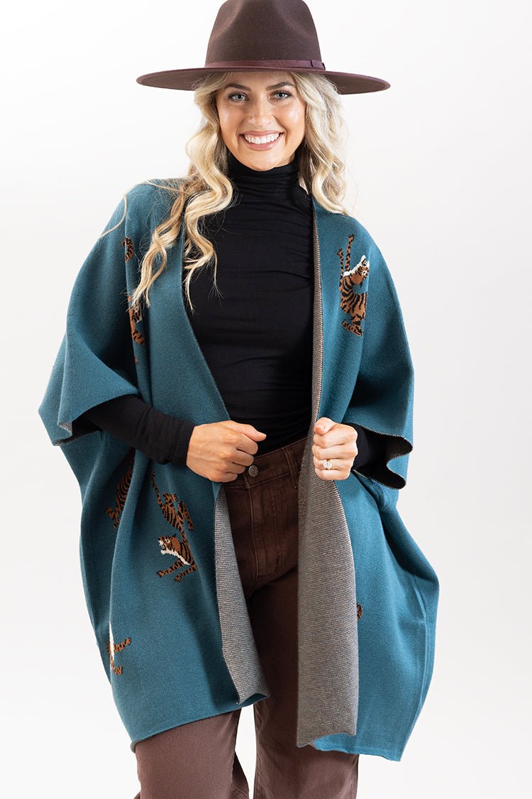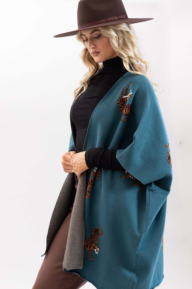 Make a bold statement in this maximalist knit featuring a striking tiger design in rich gem tones. With its open front and effortless drape, this poncho is the perfect cozy layering piece for stylish everyday wear.