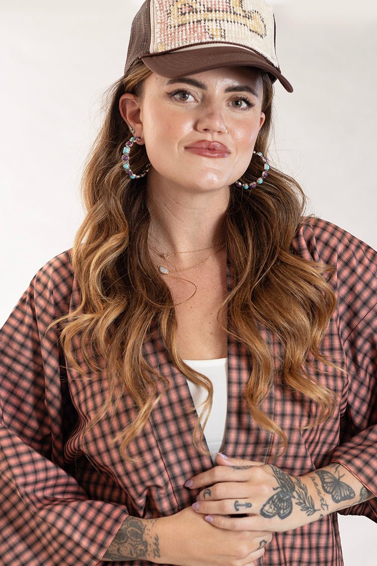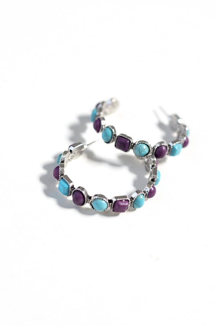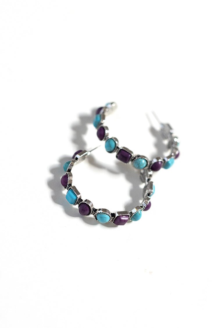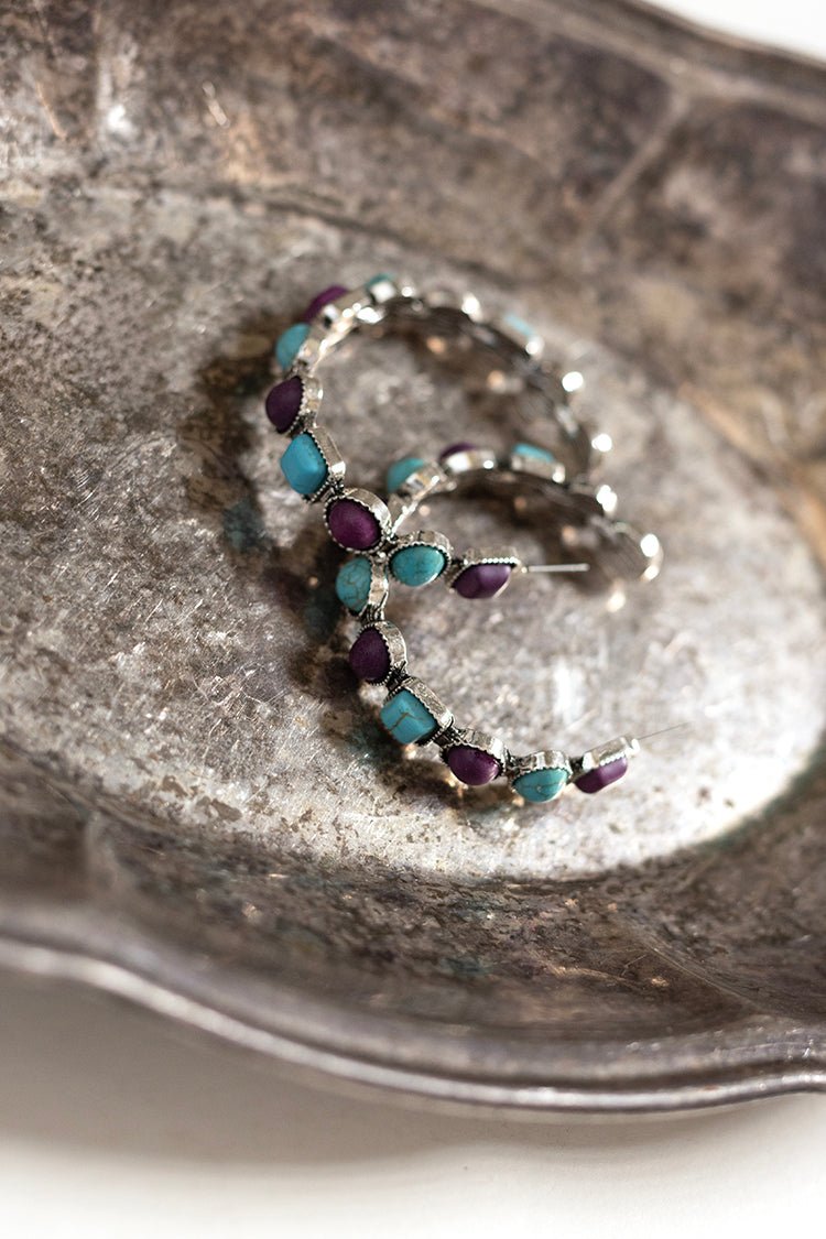 Add color and charm with these turquoise and plum stone hoop earrings. The silver setting highlights bold stones that bring subtle western flair to any look
