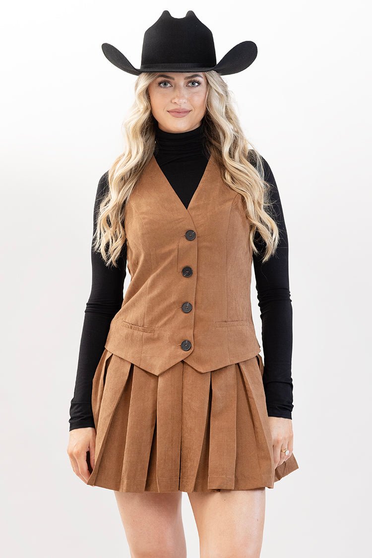 Tailored with a structured bodice and flirty pleated skirt, this versatile dress blends modern design with timeless appeal. This faux suede stunner works for everyday outings and office events to date night with heels and accessories.