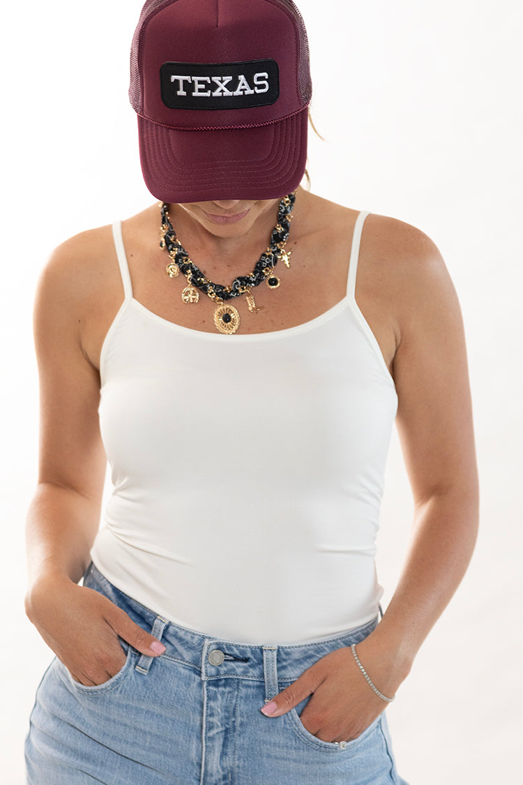 Bring a little cowgirl twist to any outfit with this charm necklace featuring a black bandana-wrapped chain with gold-tone western charms from boots to conchos.