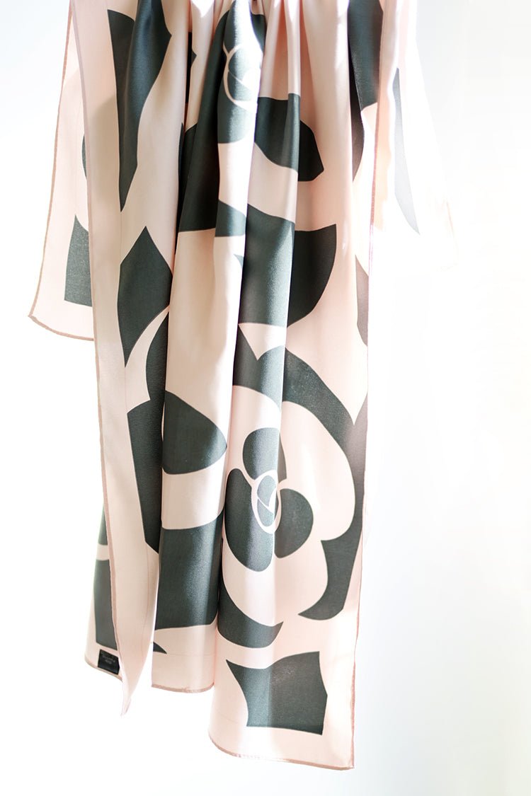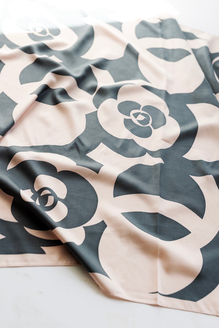 This oversized scarf oozes chic. Large, abstract, camellia flowers cover the beautiful blush silky backdrop. Wear this scarf as a neck accessory, halter top, head wrap or tied around the straps of your favorite handbag.