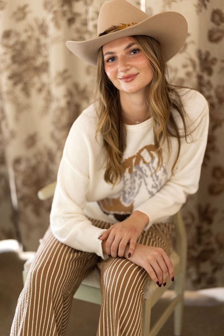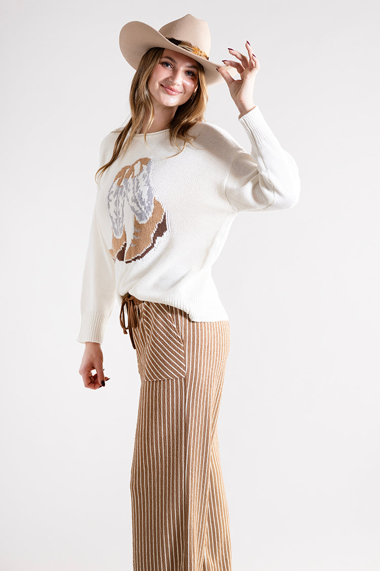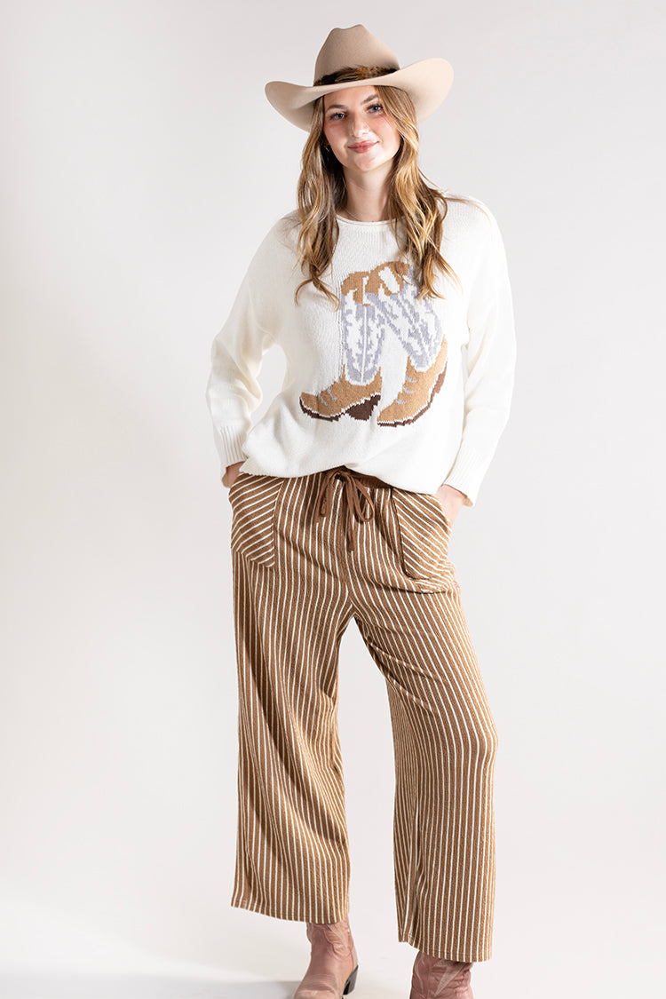 Slip into easy, everyday comfort with these camel striped lounge pants. Designed in a soft ribbed knit with a relaxed wide-leg fit, they feature an adjustable drawstring waist and handy front pockets for laid-back ease. The neutral stripes make them effortless to style with sweaters, tees and all your off-duty favorites.