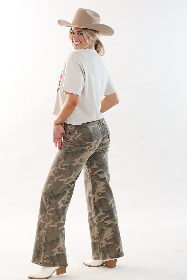 Trade your go-to blue jeans for these denim camo pants with the perfect dose of stretch. The wide leg design is comfy and cool while the pattern effortlessly works with a basic tee to graphic t-shirt. Pair with heels to dress up or sneakers for a casual look.