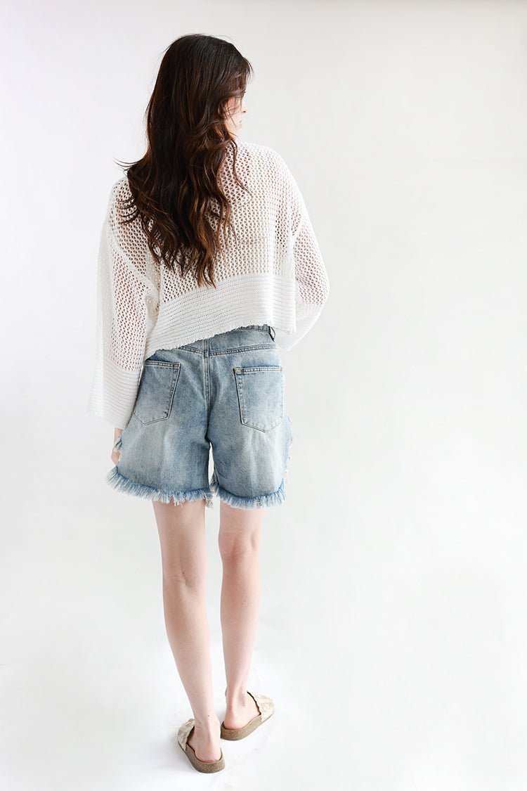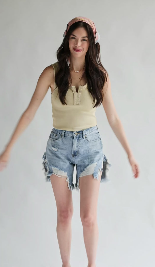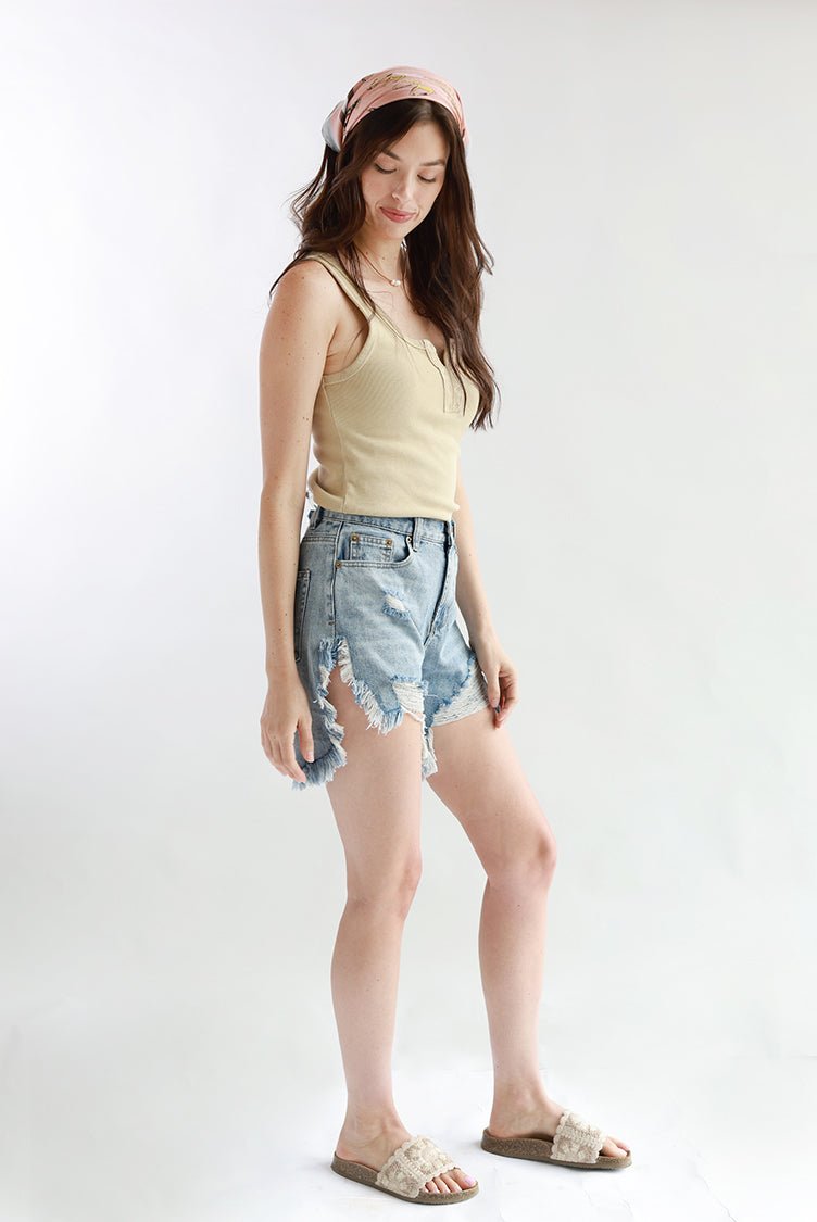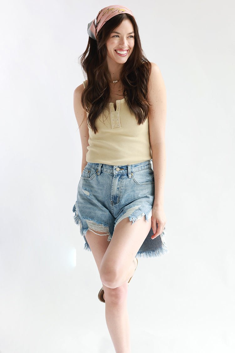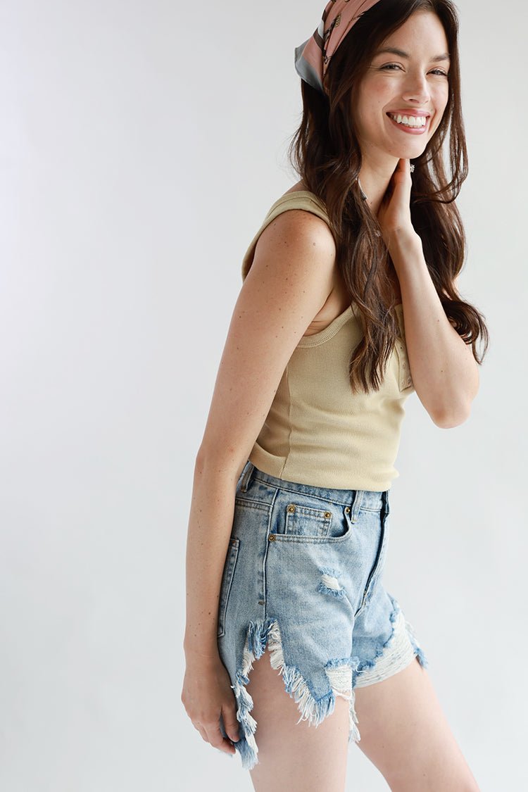 These may be our ideal cut-offs — they give the illusion of short shorts but actually provide quite a bit of coverage compared to true Daisy Dukes. Lots of distressing for a perfectly worn in look and feel.