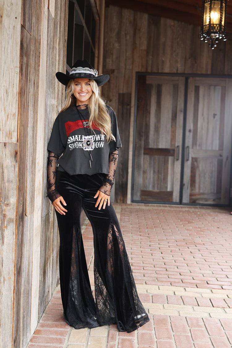 These black velvet bell bottoms deliver vintage-inspired style with a modern edge. Designed with a flattering high-rise fit, they feature soft velvet fabric and sheer lace detail that adds texture, movement and just the right amount of drama. The wide-leg silhouette makes them perfect for concerts, nights out and styled-up everyday looks. Pair them with a graphic tee, statement hat or layered accessories for an effortlessly bold outfit.