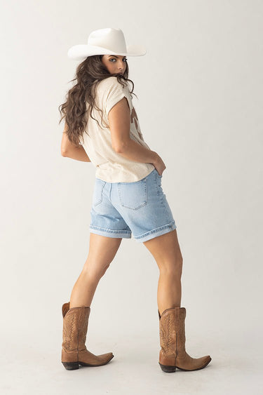 Our light wash super high rise cuffed denim shorts are your warm-weather must-have, blending vintage vibes with everyday comfort. Featuring a flattering super high rise and soft, worn-in light wash, these shorts are designed to cinch your waist and elongate your legs. The cuffed hems add a playful, polished touch while offering just the right amount of coverage, perfect for keeping things cool without going full Daisy Duke. Pair them with a cropped tank, graphic tee, or flowy blouse for endless styling options. Whether you're hitting the trails, the tailgate, or the town, these shorts are made to move with you in style.