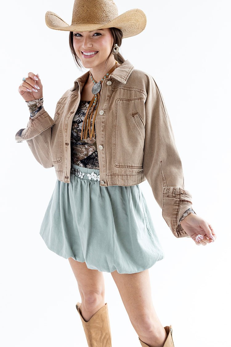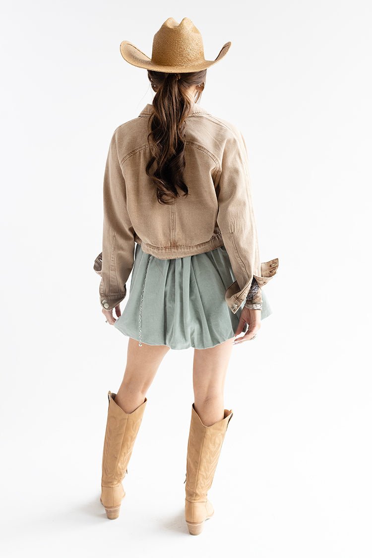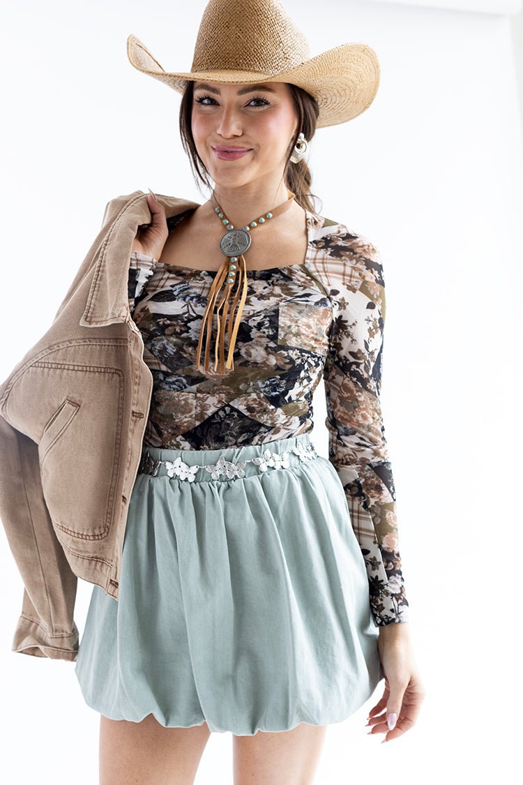 Add this solid bubble skirt to your weekly spring outfit rotation. The muted sage color pairs beautifully with neutral and bold tones while the length and voluminous shape make it easy to wear with a fitted top or casual tee. Side pockets and an elastic waist offer function and comfort.
