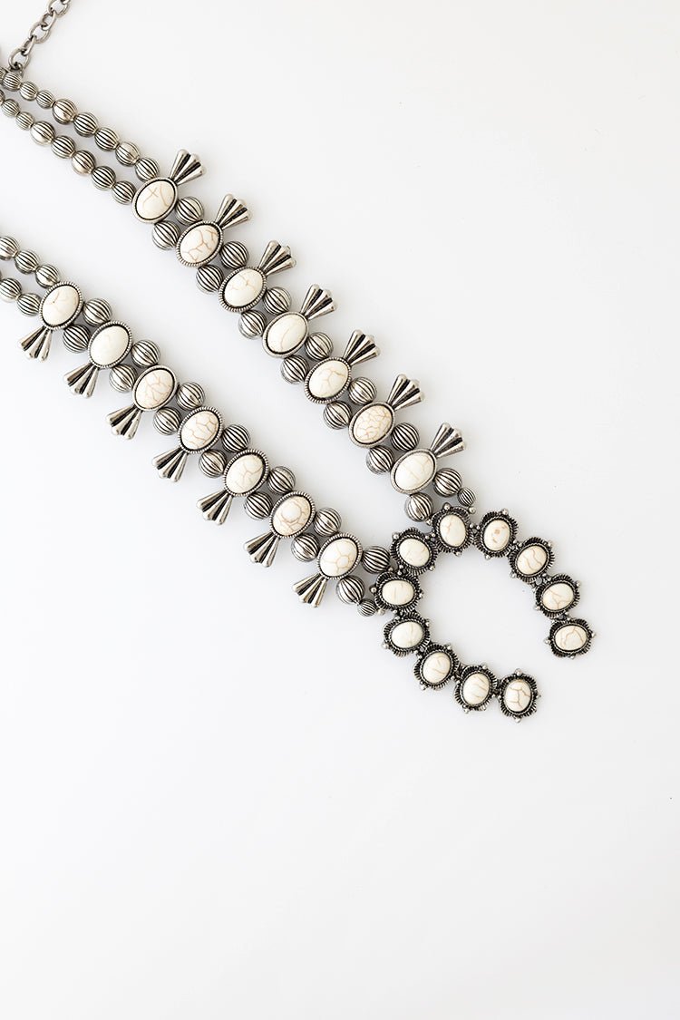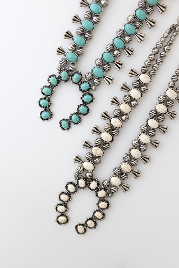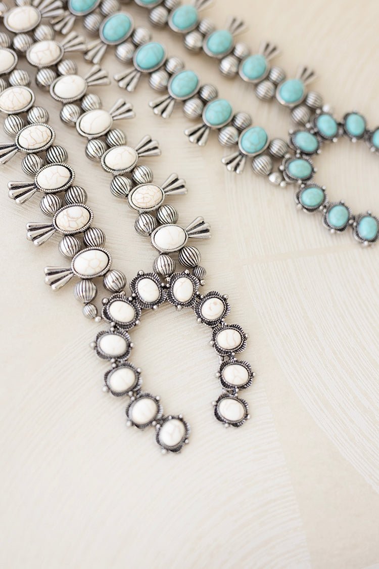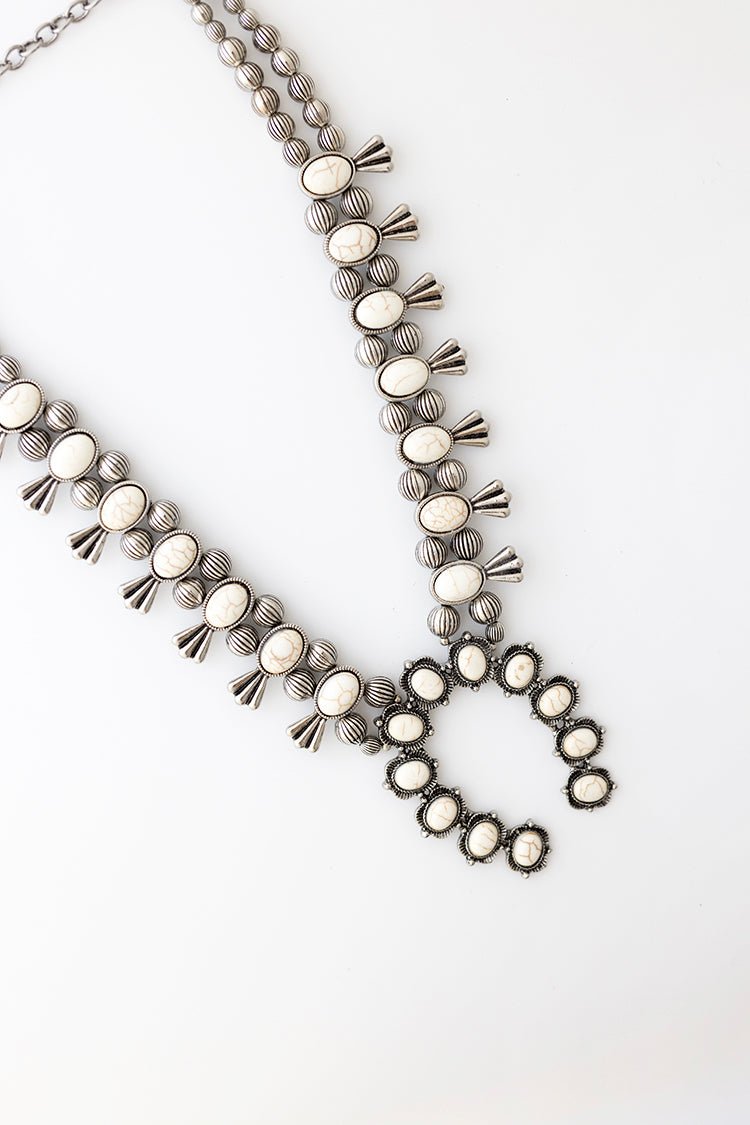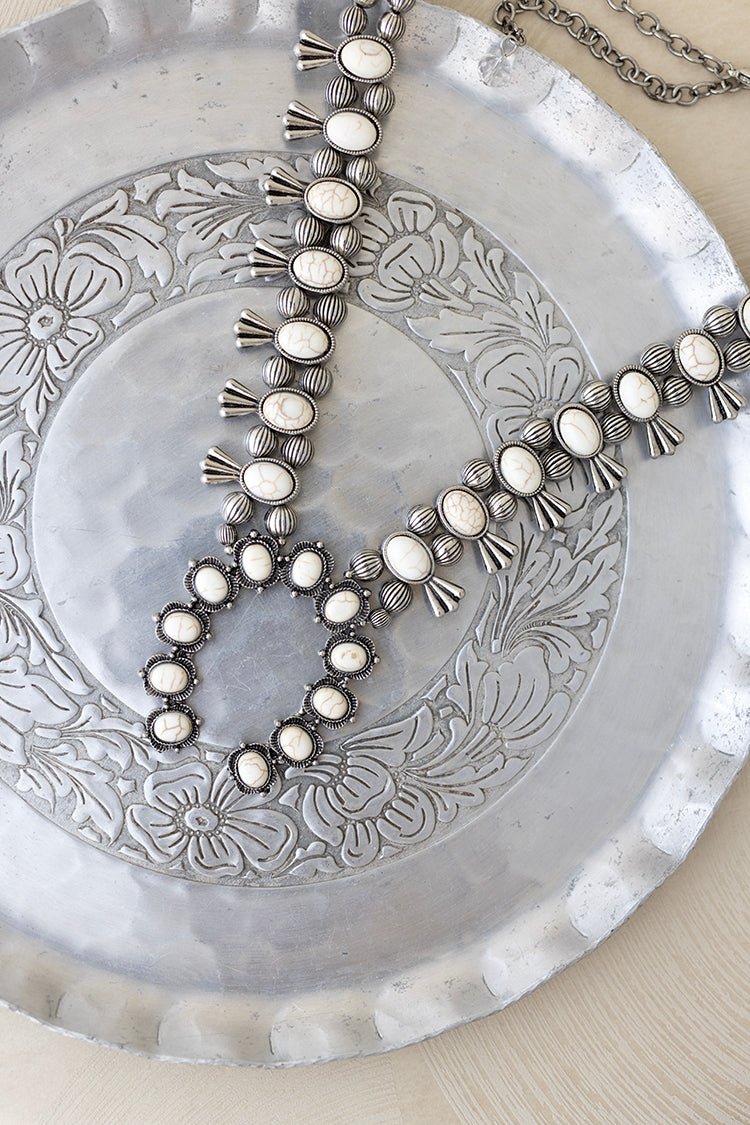 The Ivory Squash Blossom Necklace brings timeless southwestern charm with a modern, feminine twist. Featuring intricate silver-tone detailing and creamy ivory stones with delicate veining, this bold accessory is designed to turn heads. Whether you’re styling it with a flowy maxi dress, graphic tee, or your favorite denim and boots, this necklace adds instant cowgirl glam to any look. Perfect for rodeo nights, country concerts, or just adding a little western flair to your everyday vibe, this piece is made to shine, just like you