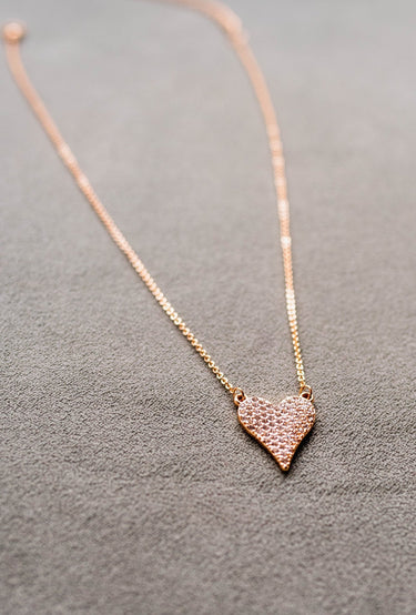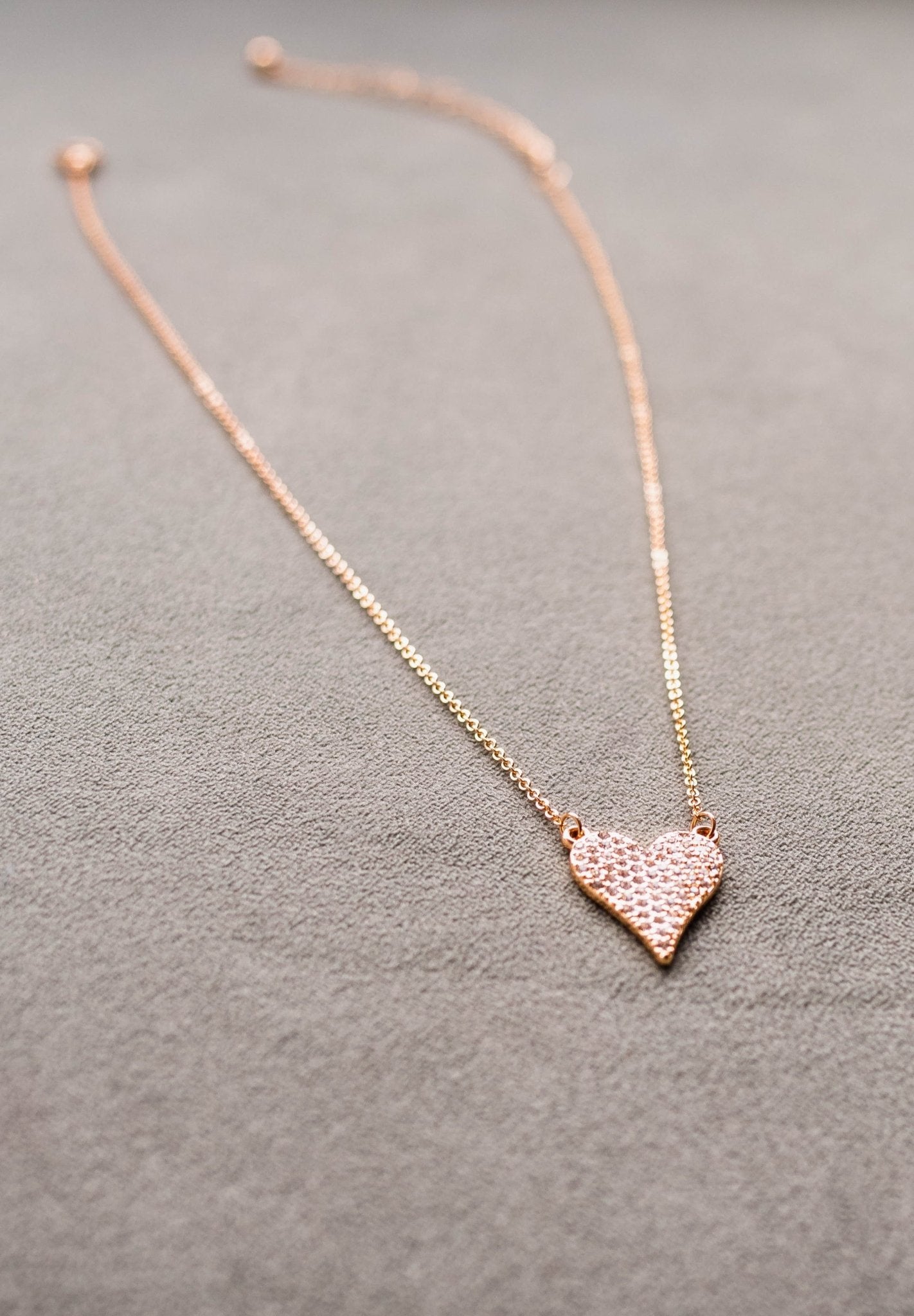 This clear pave heart necklace has the perfect bit of sparkle. This beautiful simple heart necklace looks gorgeous with an open neckline top or tucked under the collar of a button down for the perfect date night look.