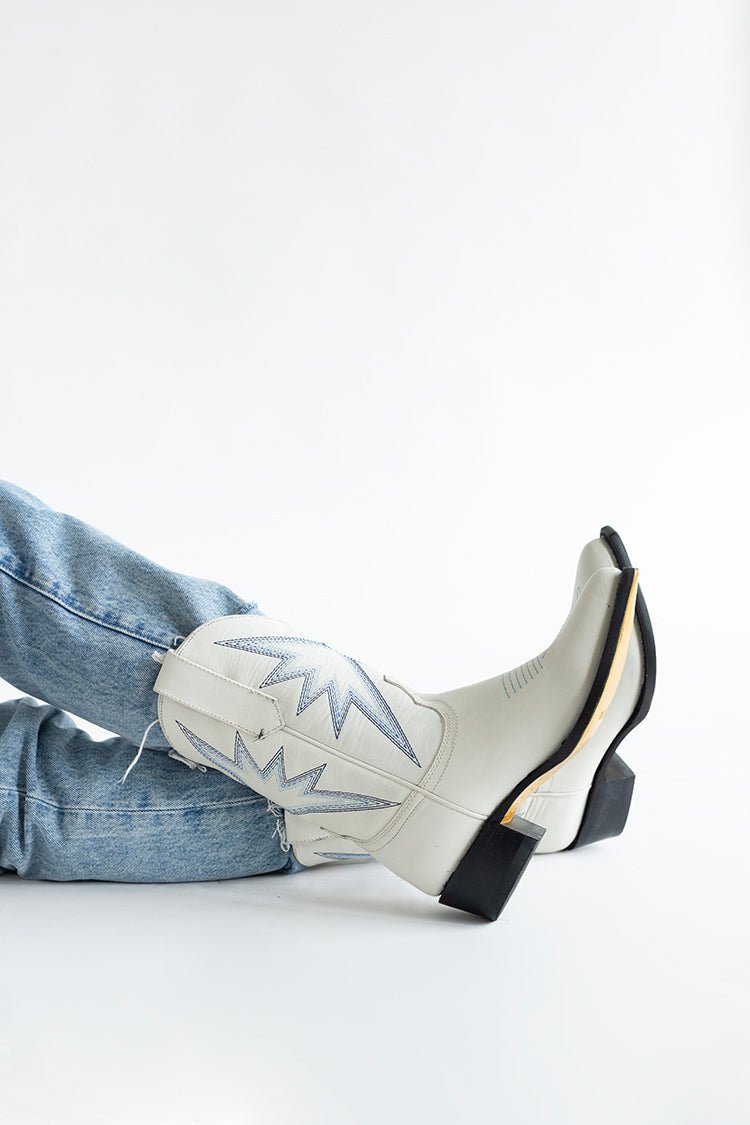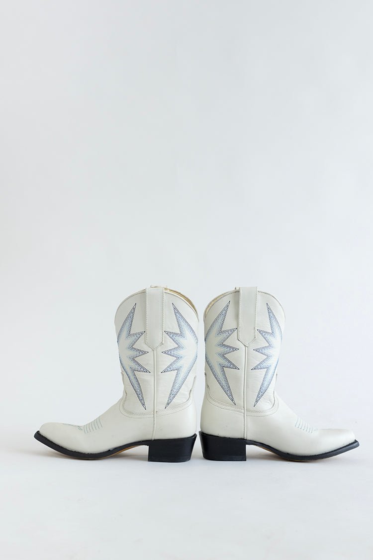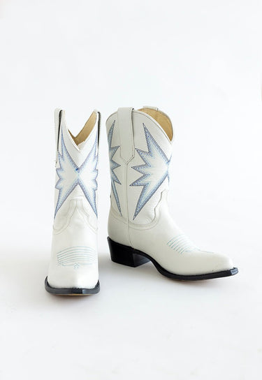 Up your footwear game with these fashion-forward white cowgirl boots. A fun sunburst design in ombré blue stitching adds extra flair to these 11" tall, supple leather beauties that are equally transitional and stylish.
