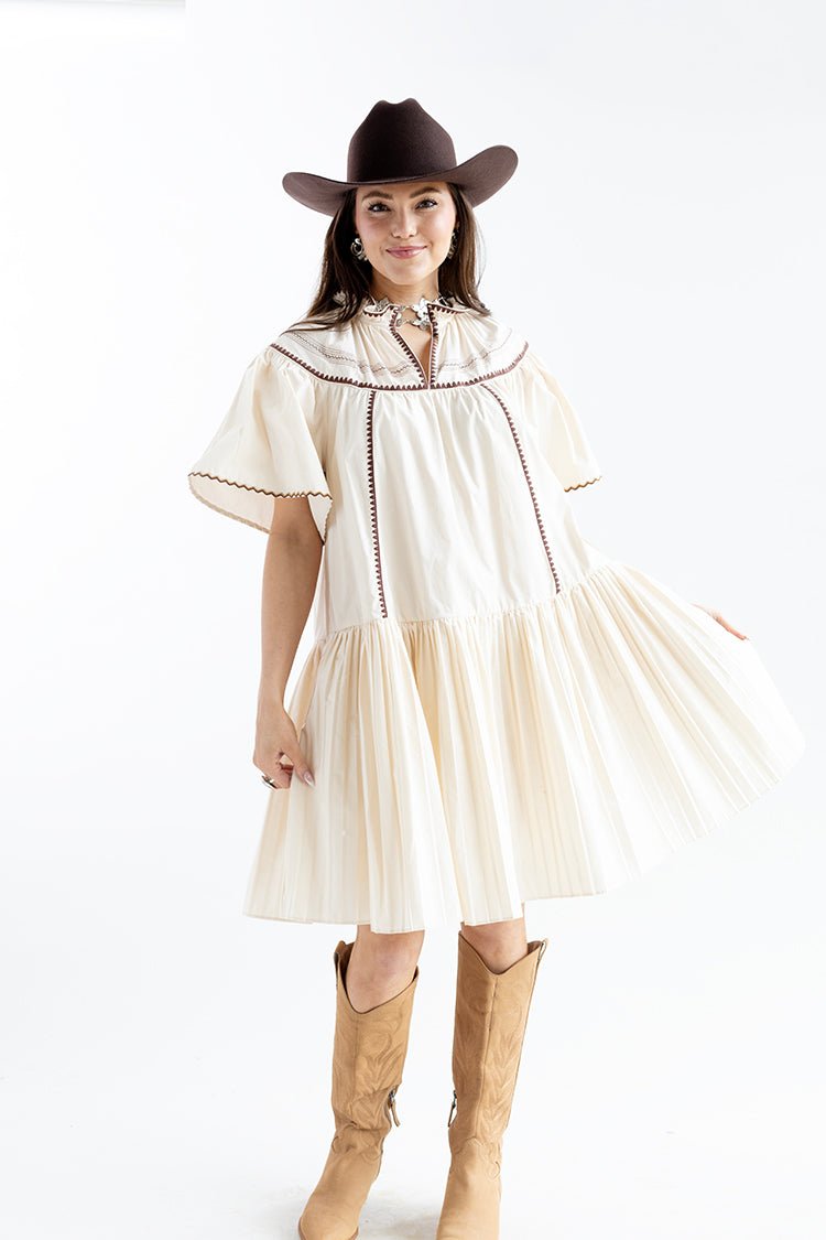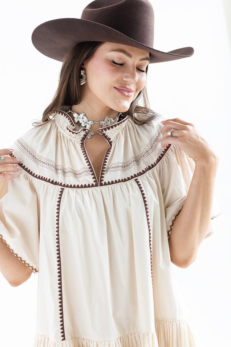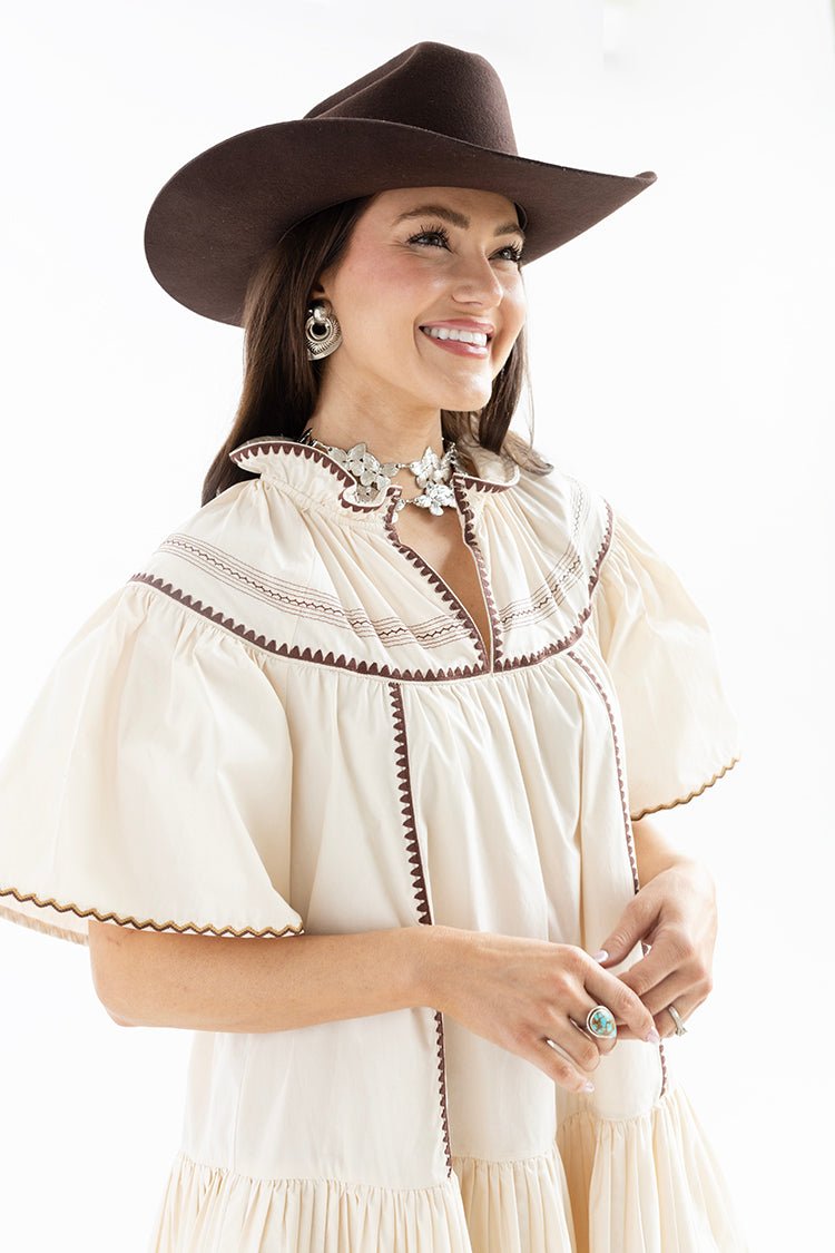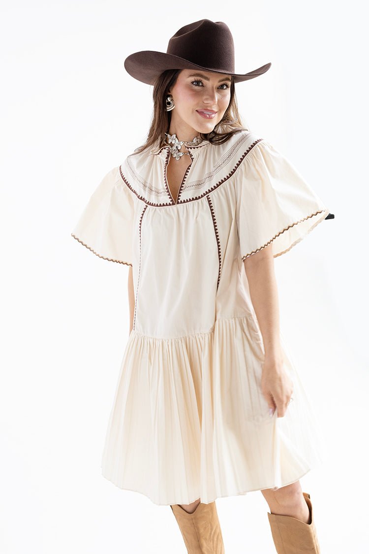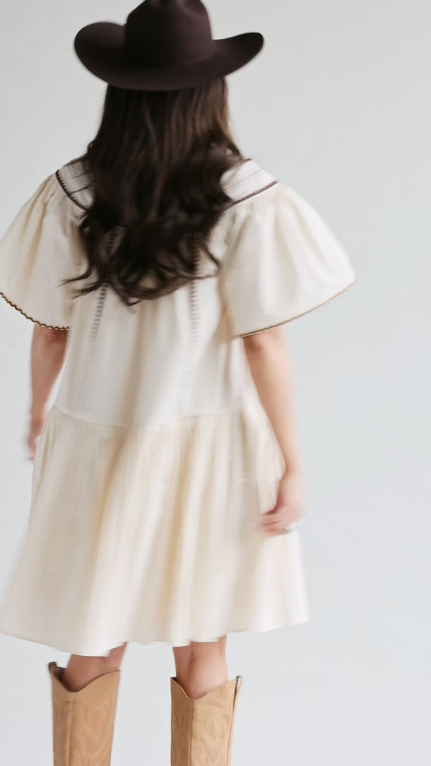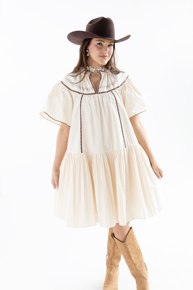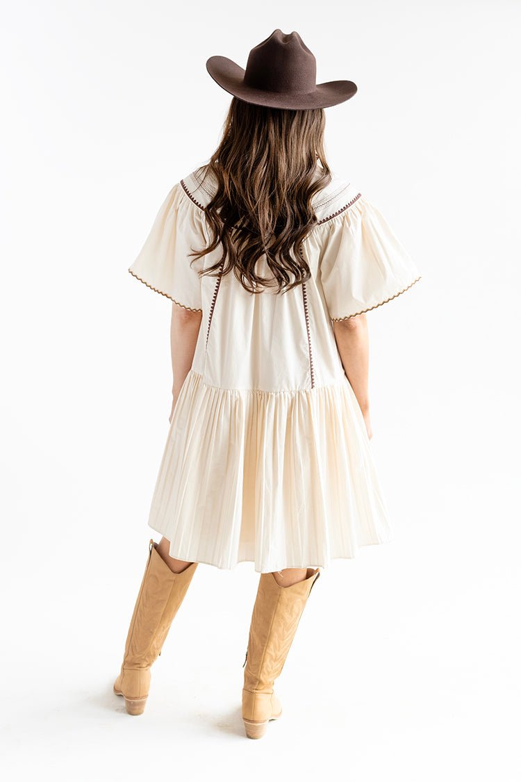 This dress is simply stunning with a striking boxy silhouette and intricate brown stitching and piping. The dropped waist is flattering and fun. Pair this dress with boots and a hat for western vibes or flats and statement earrings to swing more preppy.