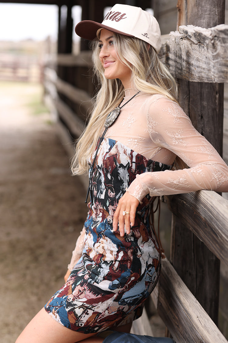 This strapless mini dress brings bold Western storytelling to life with a rich tapestry-inspired pattern and a flattering, fitted silhouette. Designed with a lace-up front detail, it adds texture, interest and a touch of vintage flair that feels both playful and statement-making. Perfect for rodeos, nights out and styled-up weekends, it pairs effortlessly with boots, lace layers or standout accessories.