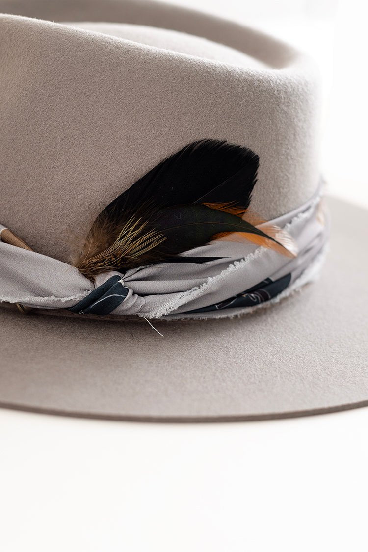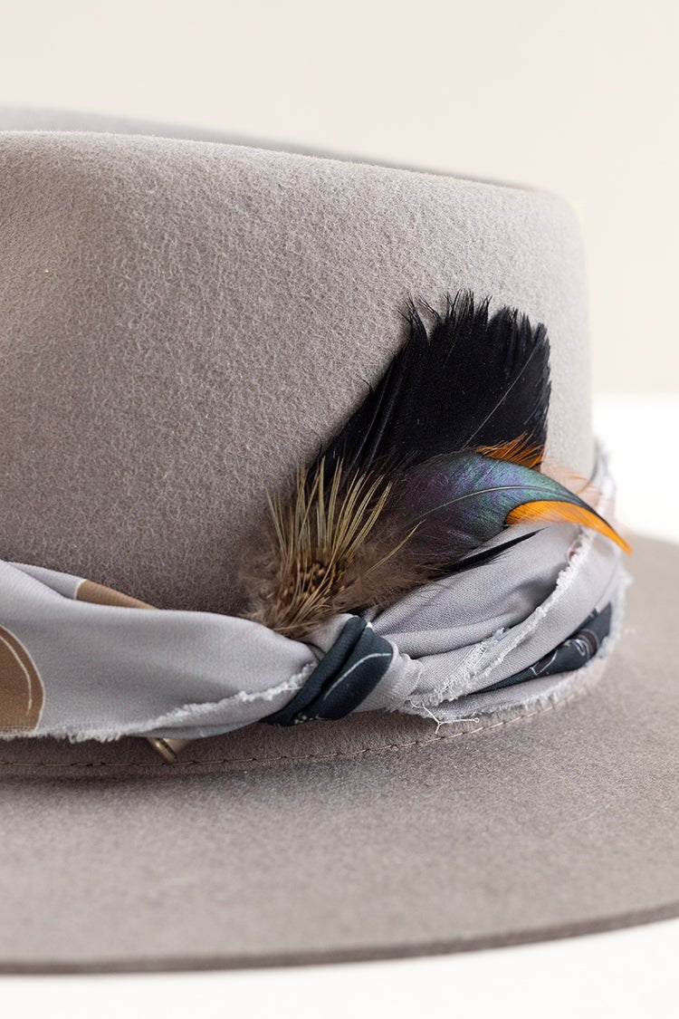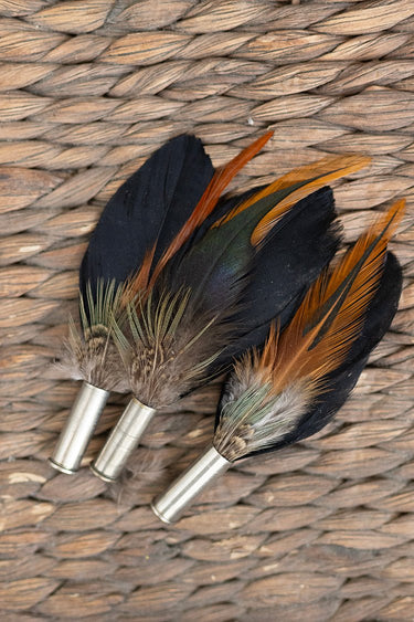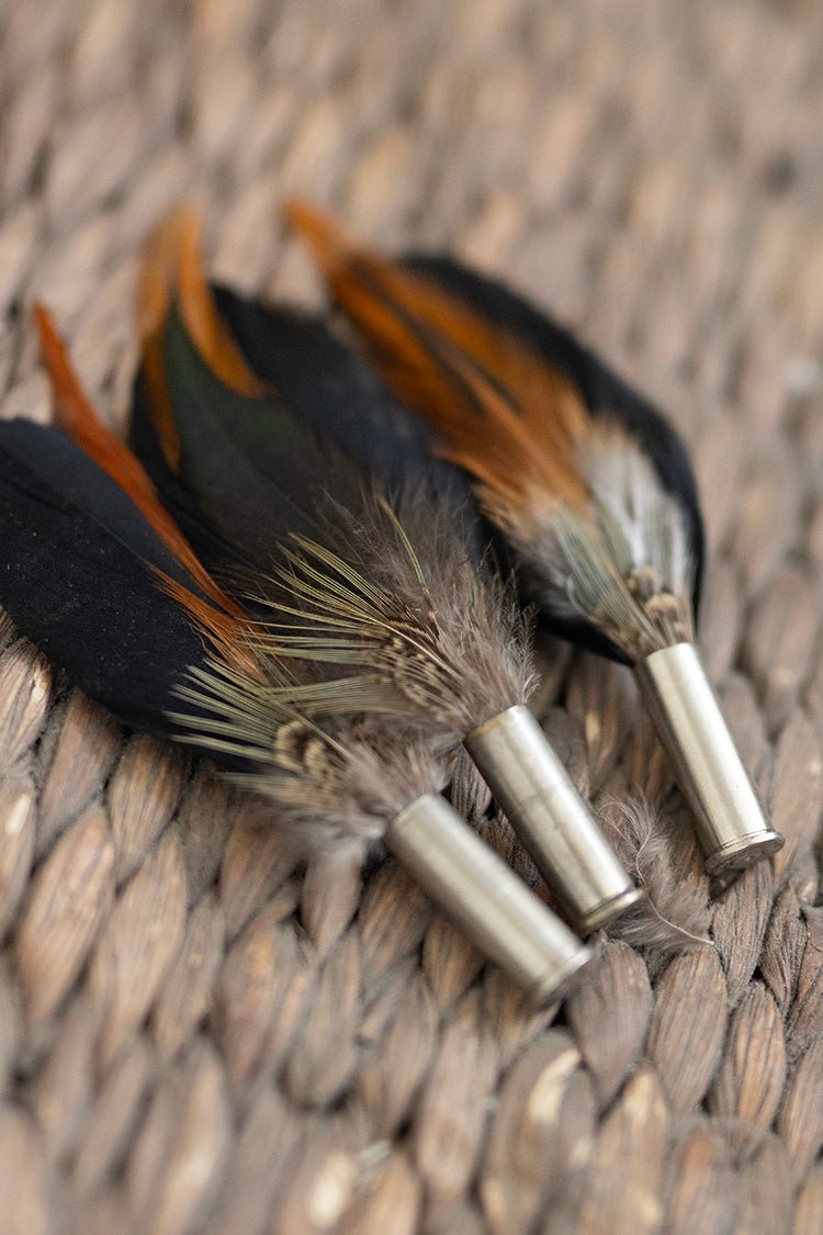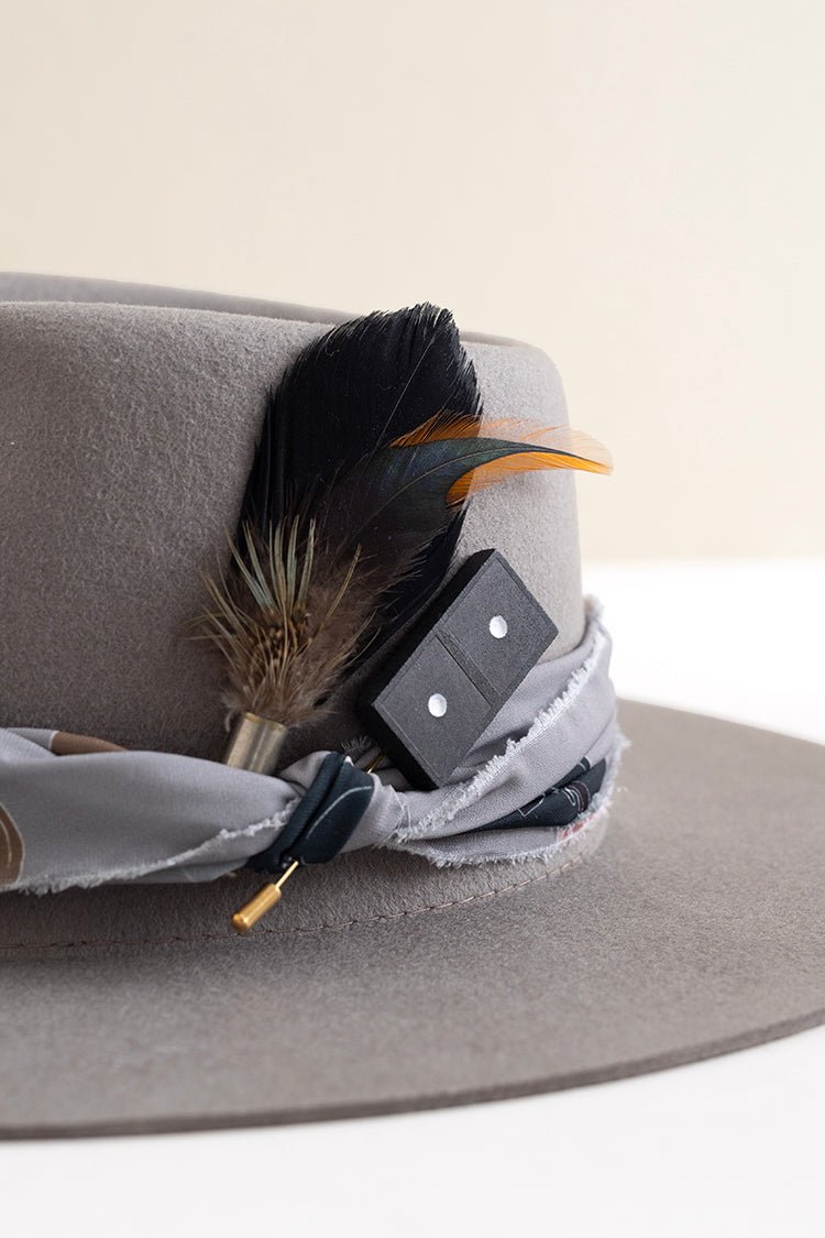 Handcrafted in our Dallas design studio and exclusive to Flea Style, this piece pairs deep black and rich rust-toned feathers with soft natural textures for a bold western statement. Finished with an upcycled brass bullet casing, it brings rugged charm and elevated style to any hat.