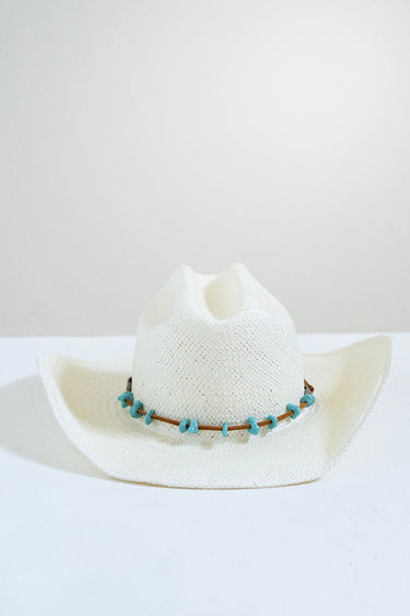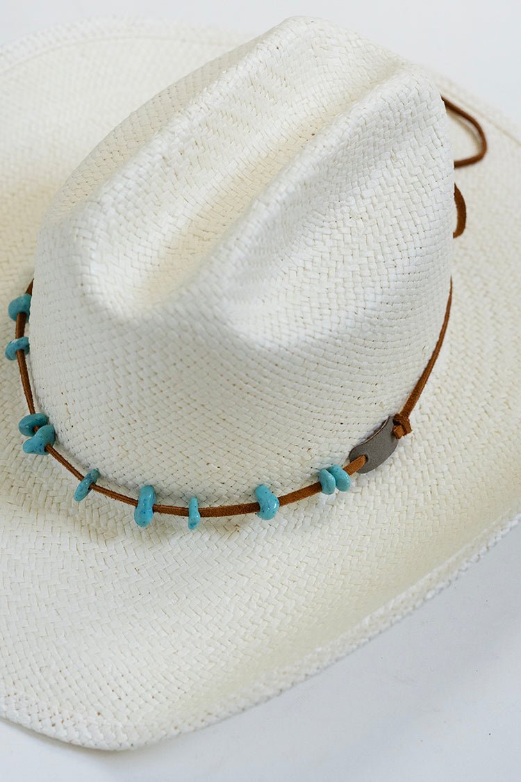 This adjustable band features genuine turquoise stones and a supple brown leather cord. It offers the perfect mix of rugged and refined and a simple stylish way to give your favorite hat a classic cowboy twist.