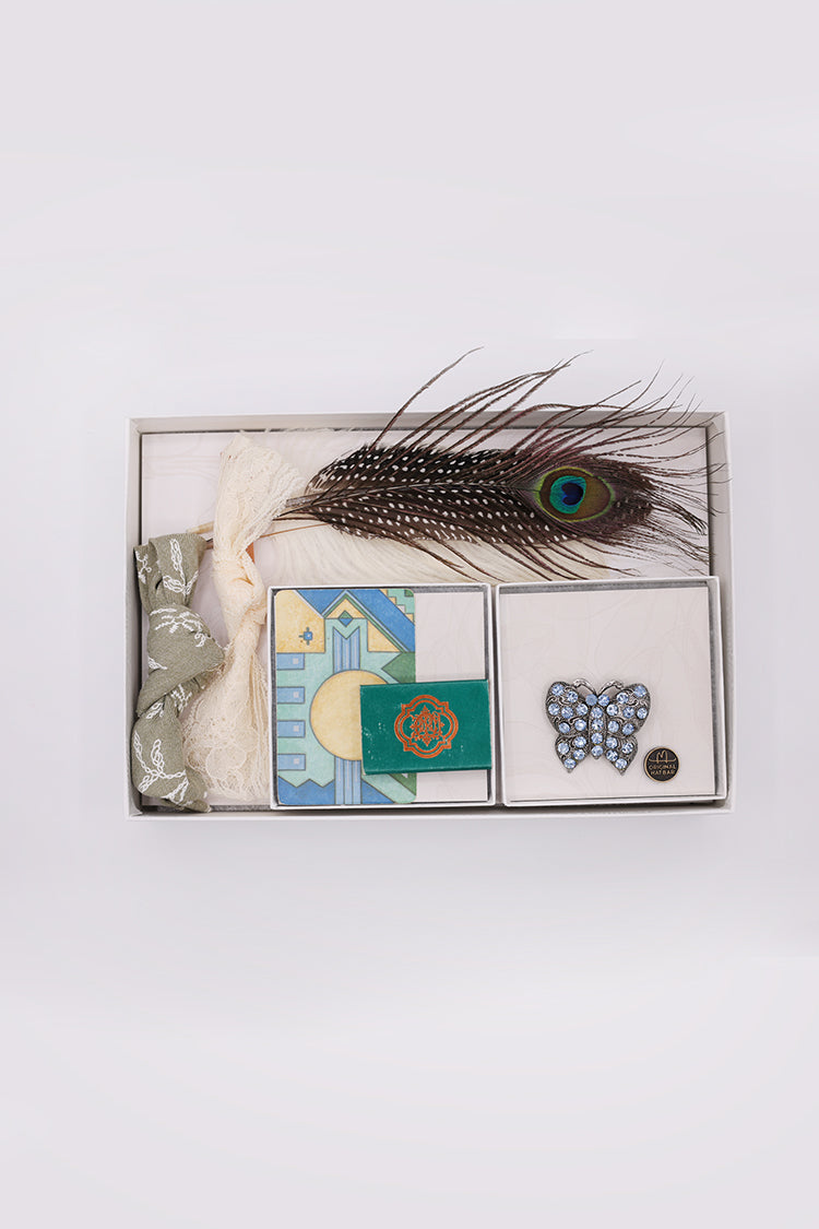 The bohemian kit has free-spirit vibes combining vibrant colors, natural materials and global influences that foster eclectic, layered hats. A vintage teal + gold matchbook adds some fun to the vintage blue butterfly brooch and blue Southwestern playing card combo.