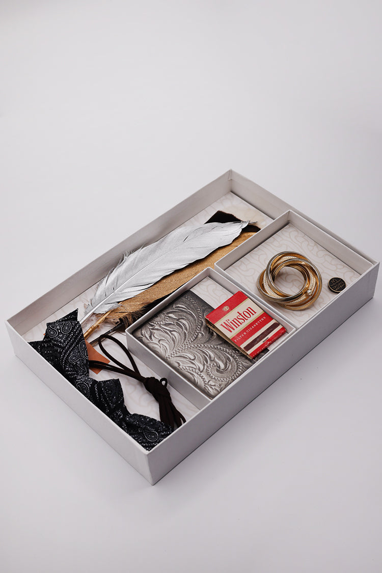 - Includes feathers, hatbands, a playing card, matchbook, vintage brooch and Original Hat Bar bronze pin