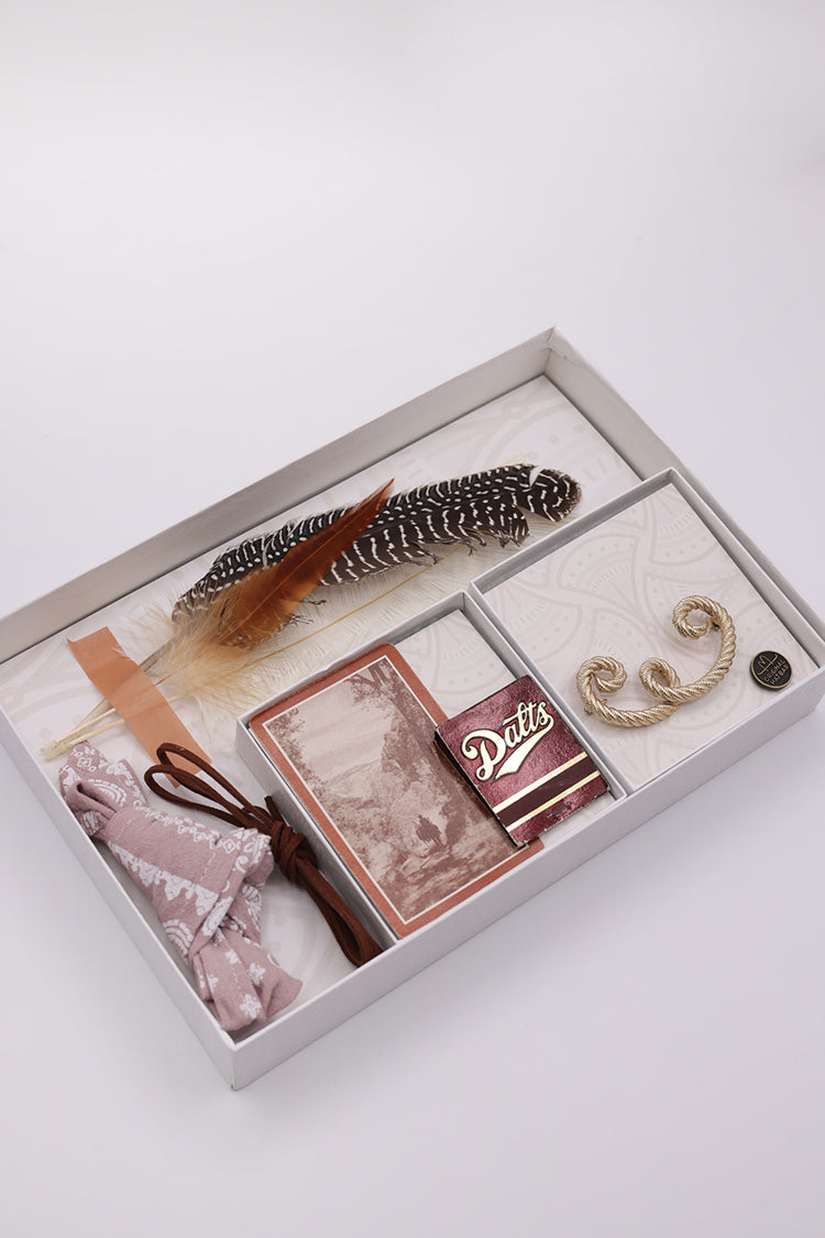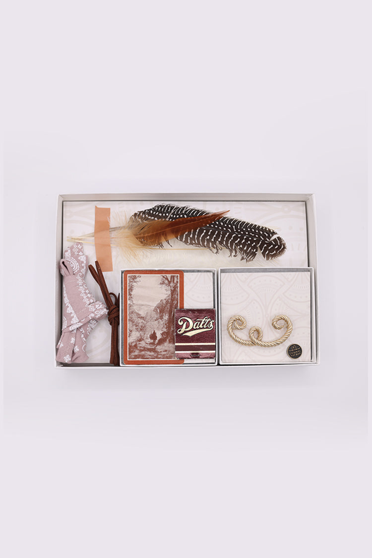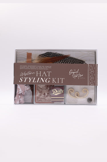 The Western kit channels classic cowboy vibes with earthy hues and Americana motifs. The vintage gold scroll rope brooch adds rodeo-inspired feels to a cowboy hat while the vintage nature-inpired playing card grounds it.