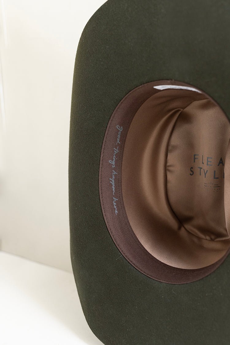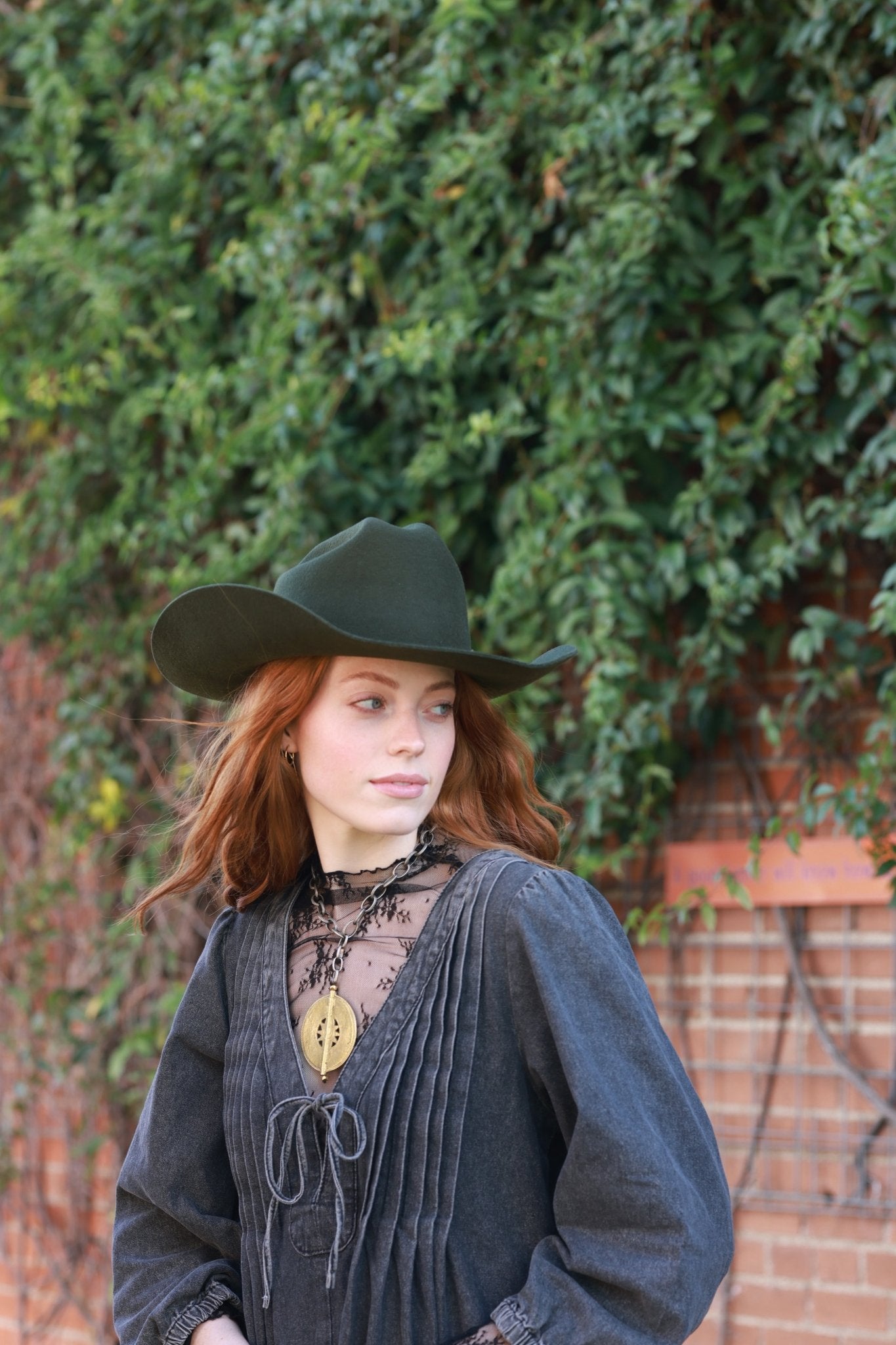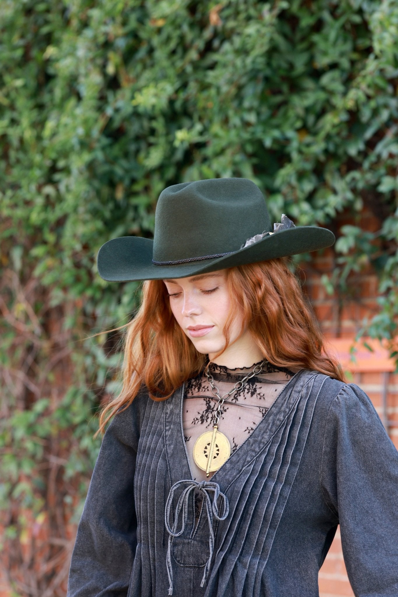 Channel classic western charm with our deep green pine Rider cowboy hat, crafted from premium curled-brim wool for an authentic look and feel. This versatile hat features a modern western silhouette that pairs rugged elegance with everyday wearability. The structured brim and bold color make it a standout piece for ranch days, festivals, or city adventures.