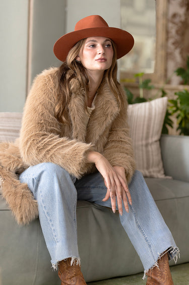 Add luxe warmth and vintage-inspired flair with our faux fur camel jacket. The cozy notch collar, longline cut and convenient pockets make it perfect for layering over denim or dresses all season long. The jacket’s western-inspired horse lining adds a playful surprise that feels uniquely Flea Style.