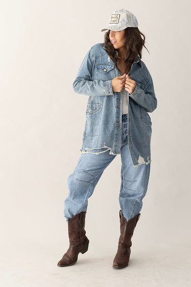 Our medium washed denim western shacket is the perfect mix of rugged and relaxed, giving you that effortlessly cool, lived-in look. Featuring a classic western yoke, oversized silhouette, and distressed frayed hem, this piece is made for throwing on and stepping out. Double chest pockets and side pockets add utility, while the medium wash gives it a timeless, vintage vibe. Wear it buttoned up as a dress or open over your favorite basics, this versatile shacket is ready to take your wardrobe from season to season in laid-back western style. Yeehaw meets everyday edge!