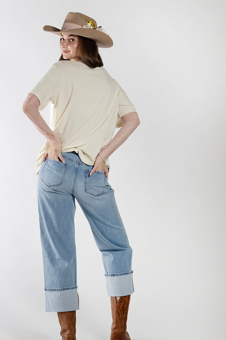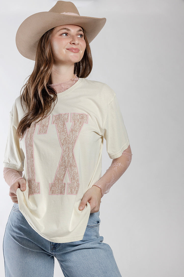Celebrate laid-back Texas style with this oversized graphic tee. Designed with a bold “TX” graphic in a delicate lace-inspired print, this casual top blends Western pride with a feminine twist. It’s a versatile staple that pairs effortlessly with denim, boots, or a skirt. Wear a lace mock neck top underneath to layer your look and add style.