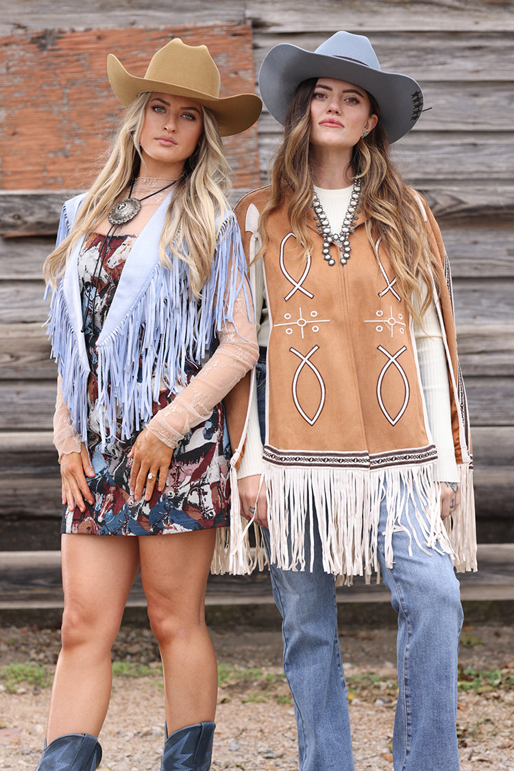 This light blue suede-like layer brings soft texture and dramatic fringe for a look that feels playful and polished. Designed with an open front and easy drape, it adds movement and dimension with an effortless, flowing feel. Perfect for layering over tanks, tees or dresses, it works for concerts, nights out and everyday styling.