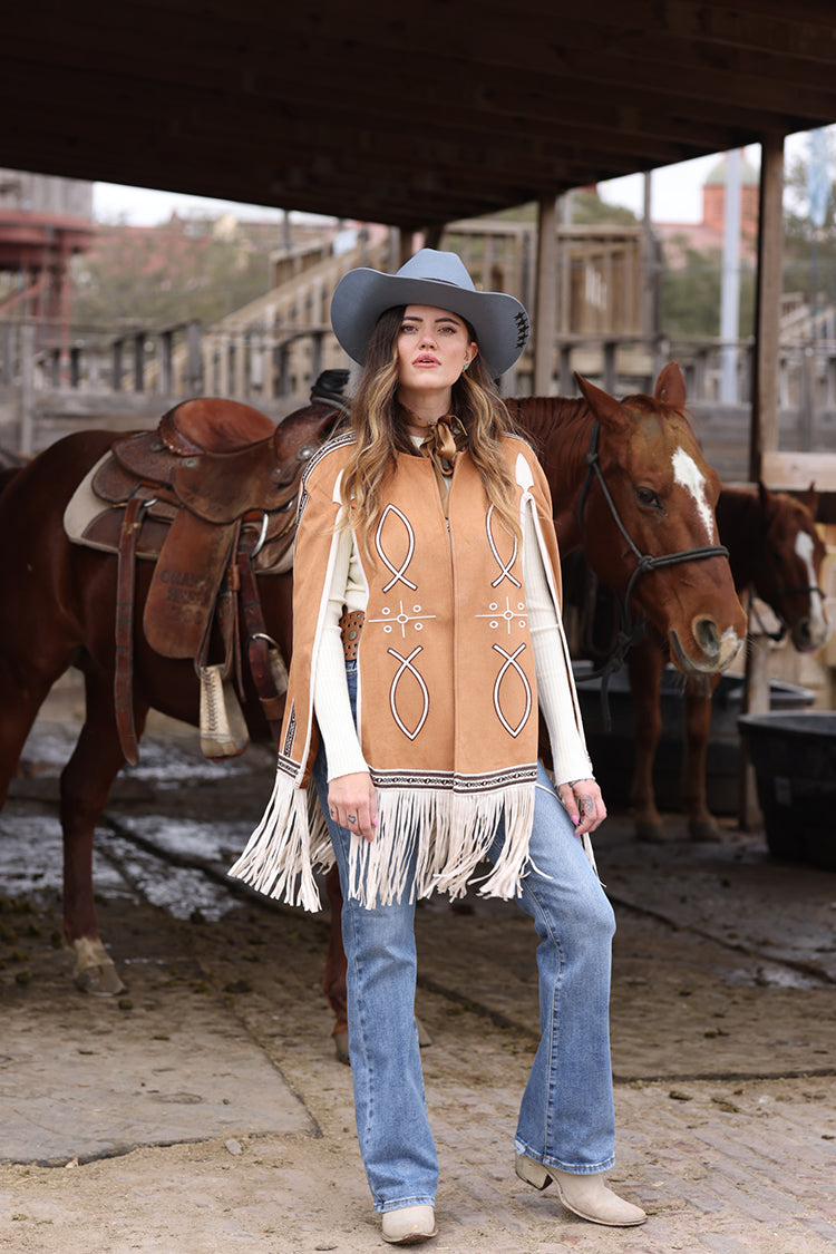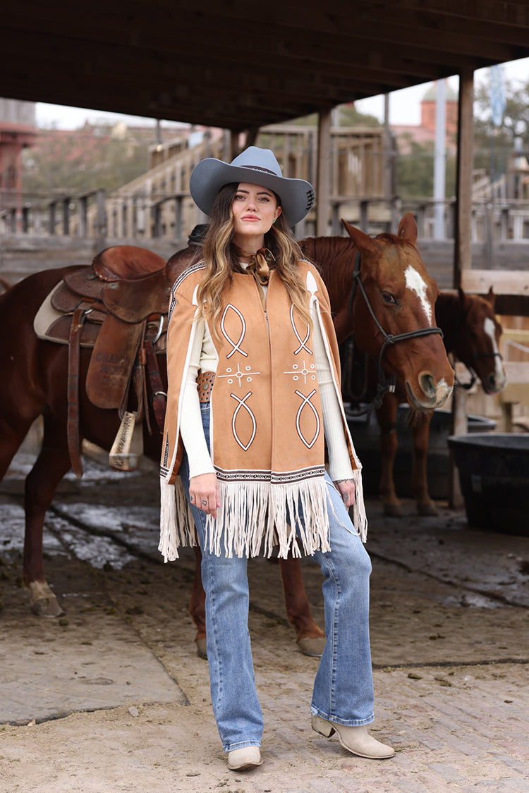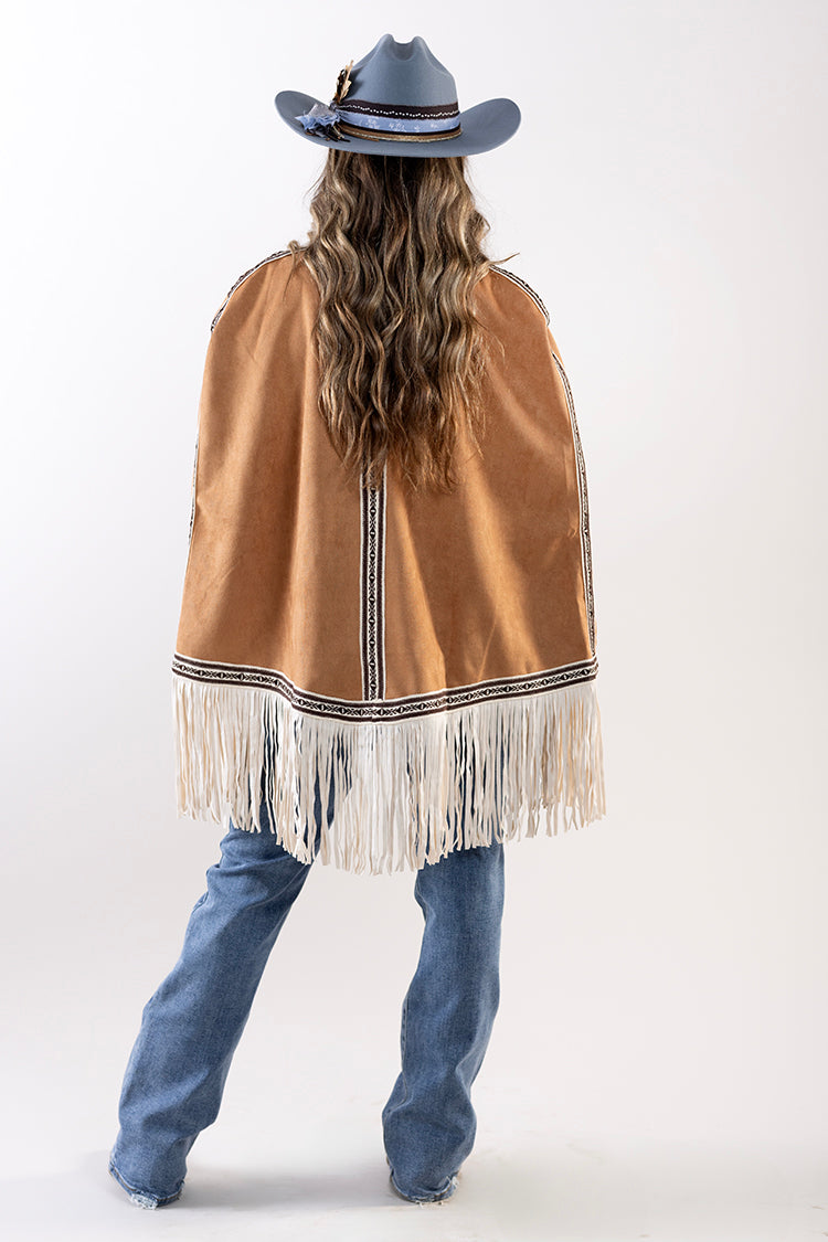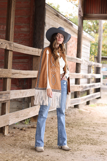 This light brown fringe cape brings statement-making Western-inspired style with beautiful embroidered details and soft mov