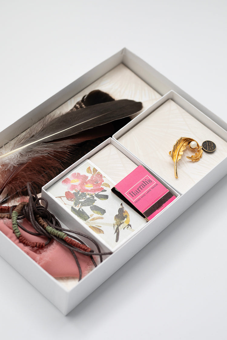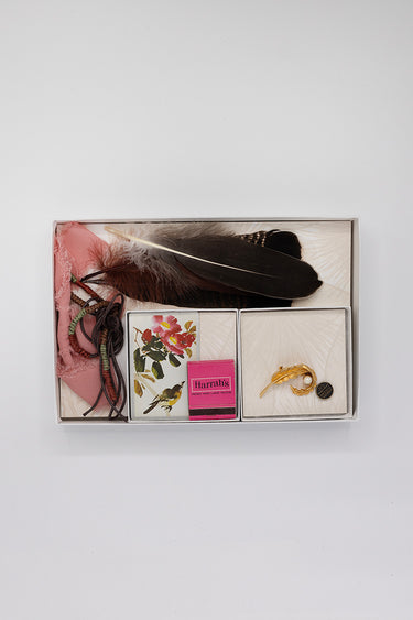 - Includes feathers, hatbands, a playing card, matchbook, vintage brooch and Original Hat Bar bronze pin