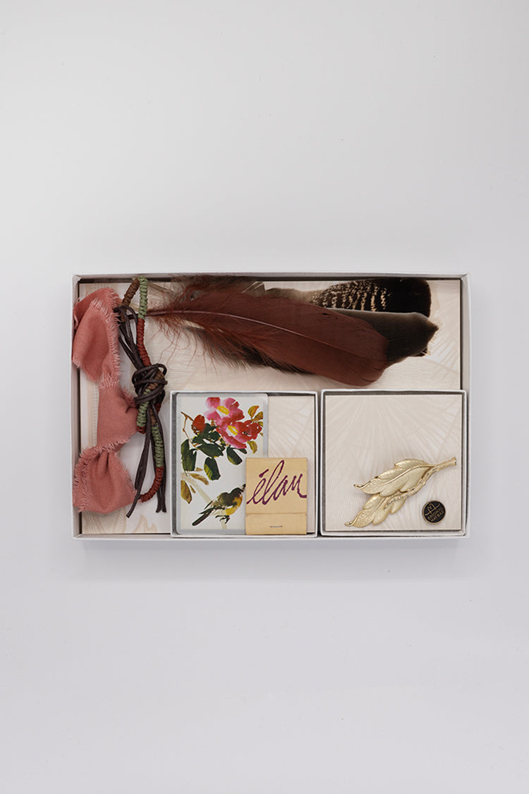 - Includes feathers, hatbands, a playing card, matchbook, vintage brooch and Original Hat Bar bronze pin
