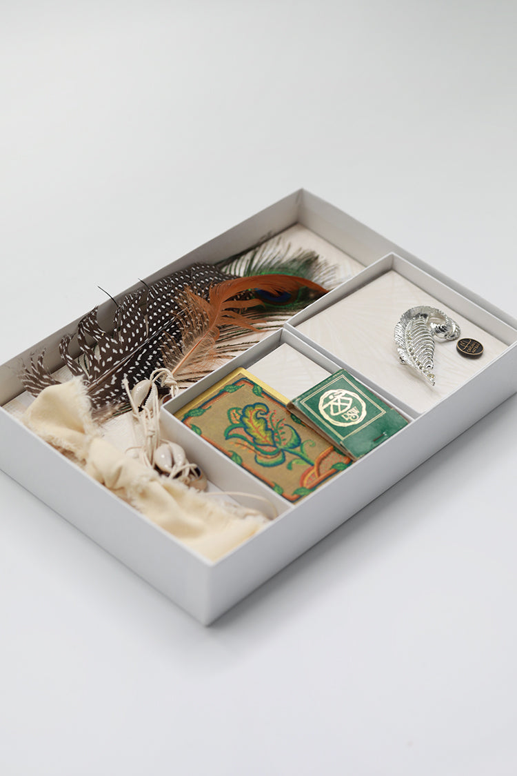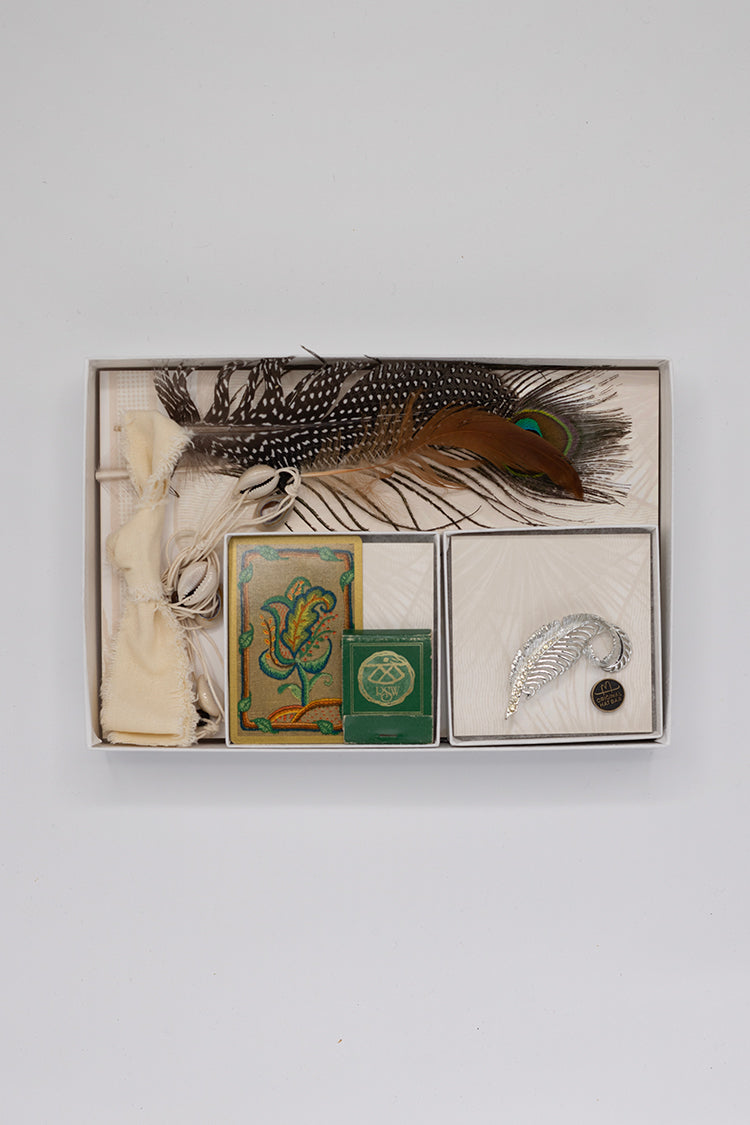- Includes feathers, hatbands, a playing card, matchbook, vintage brooch and Original Hat Bar bronze pin