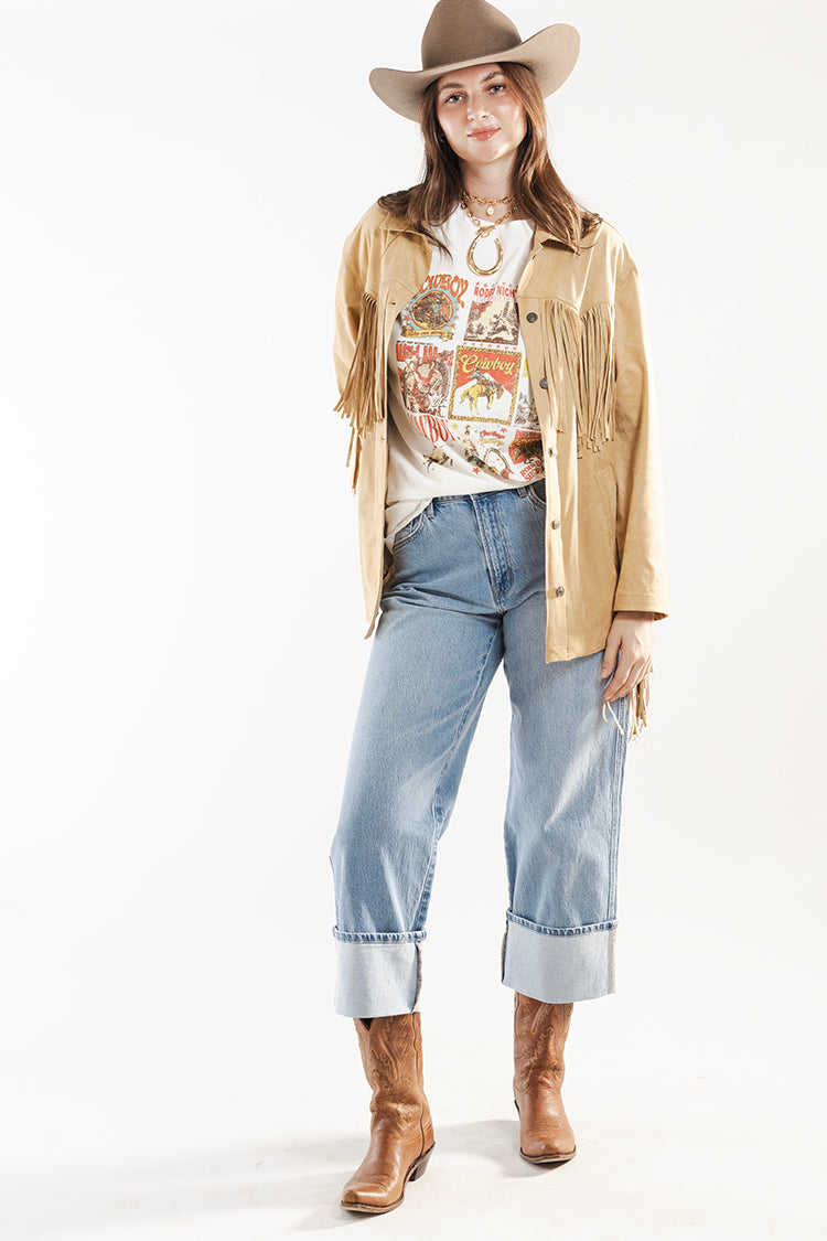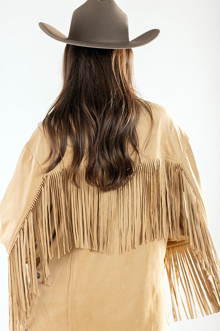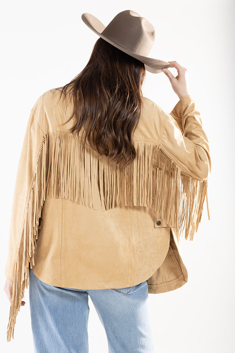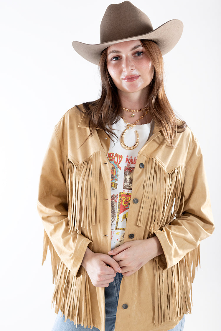 Channel vintage rodeo glam with this statement fringe jacket. Designed with a soft faux suede, sweeping back fringe, and a relaxed Western silhouette, it brings movement and bold character to every step. It’s the kind of standout layer that pairs effortlessly with denim and boots for nights out, concerts, or anywhere you want to make an entrance.