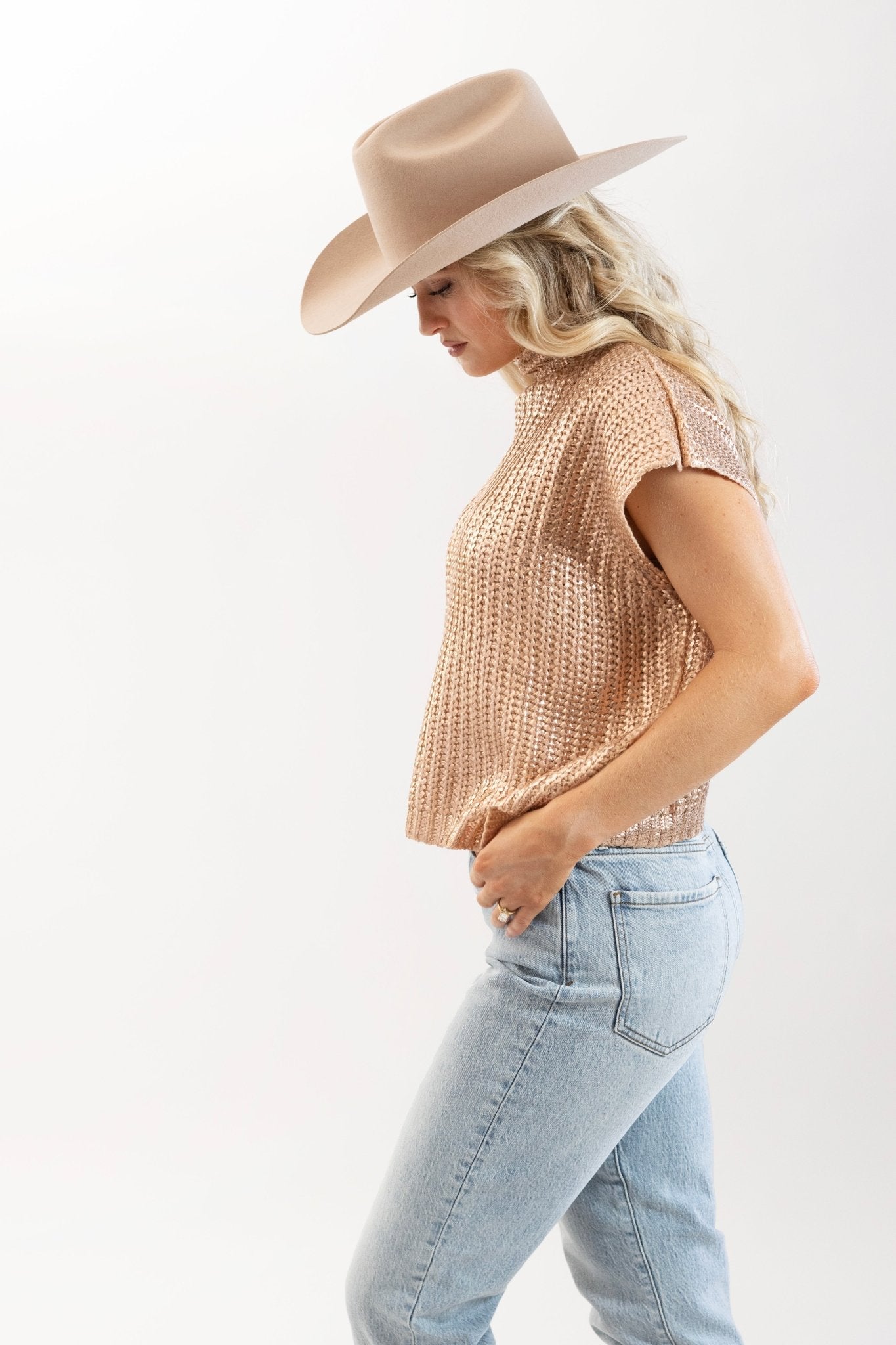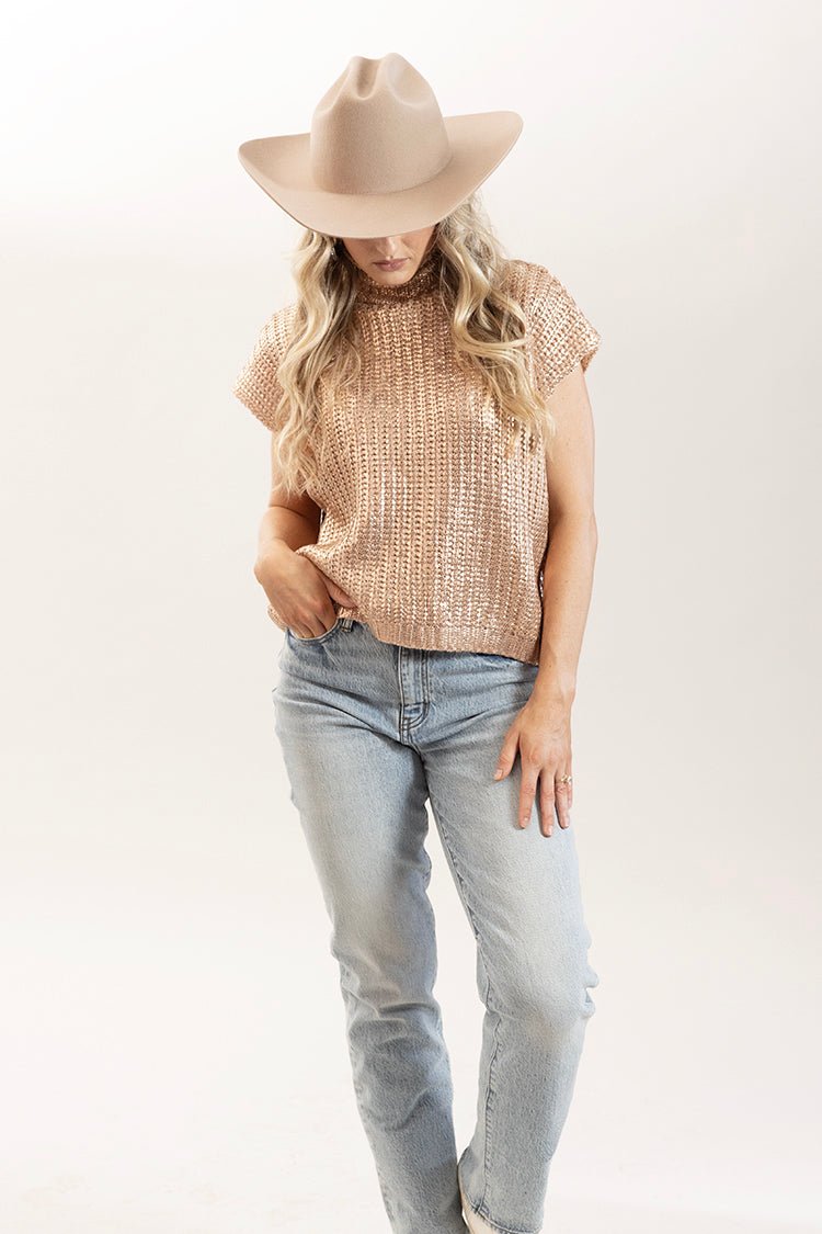 Add subtle shine to your wardrobe with this metallic, rose gold sweater. The relaxed fit, braided texture and soft shimmer make it an easy piece to dress up with trousers or pair casually with jeans. Cozy yet polished, it’s the versatile sweater you’ll reach for season after season.
