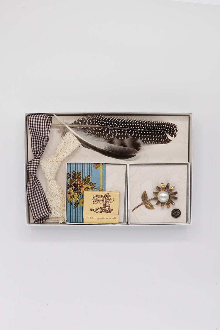 - Includes feathers, hatbands, a playing card, matchbook, vintage brooch and Original Hat Bar bronze pin