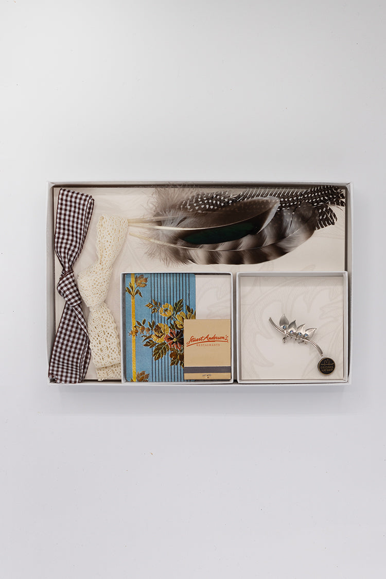 - Includes feathers, hatbands, a playing card, matchbook, vintage brooch and Original Hat Bar bronze pin