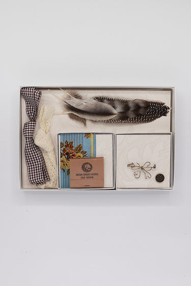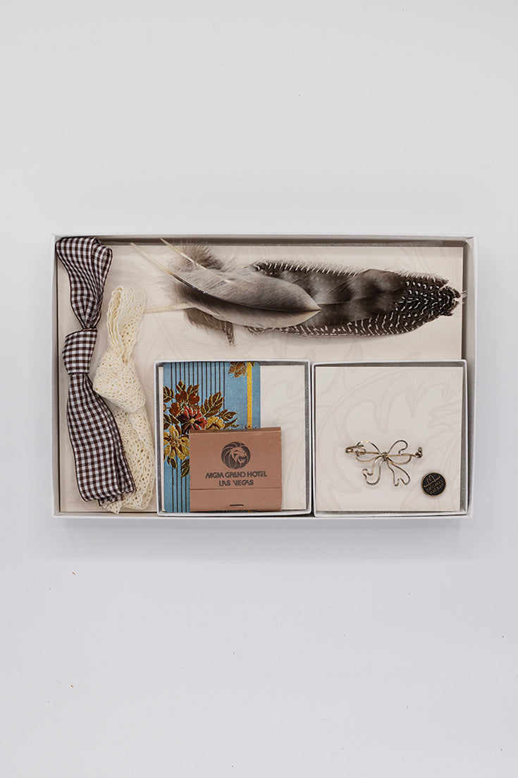 - Includes feathers, hatbands, a playing card, matchbook, vintage brooch and Original Hat Bar bronze pin