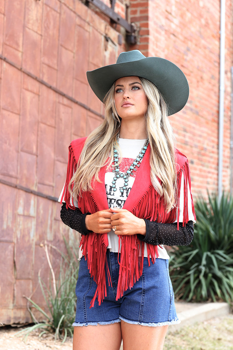 This rich red suede-like layer brings bold color and dramatic fringe for a look made to turn heads at the rodeo and beyond. Designed with an open front and easy drape, it adds movement and texture that instantly amps up any outfit. Perfect for layering over tanks, tees or dresses, it styles effortlessly for rodeos, concerts and nights out.