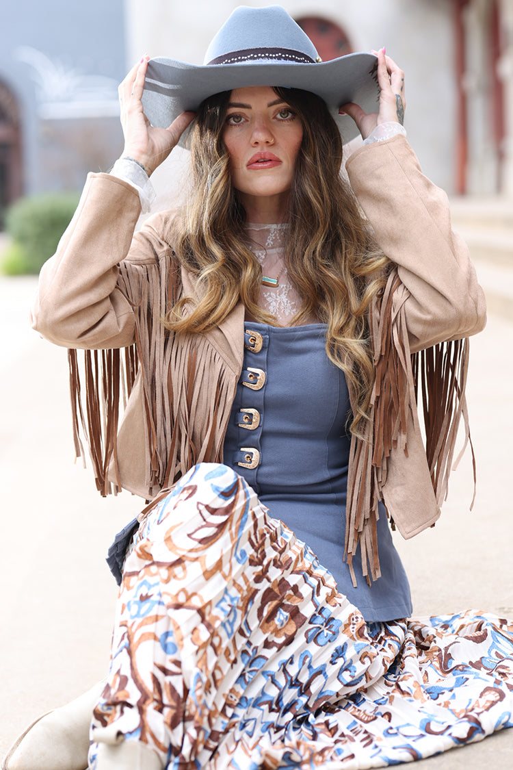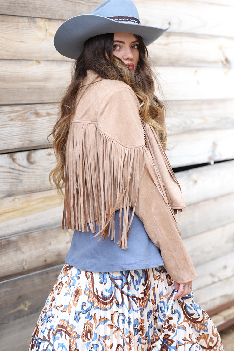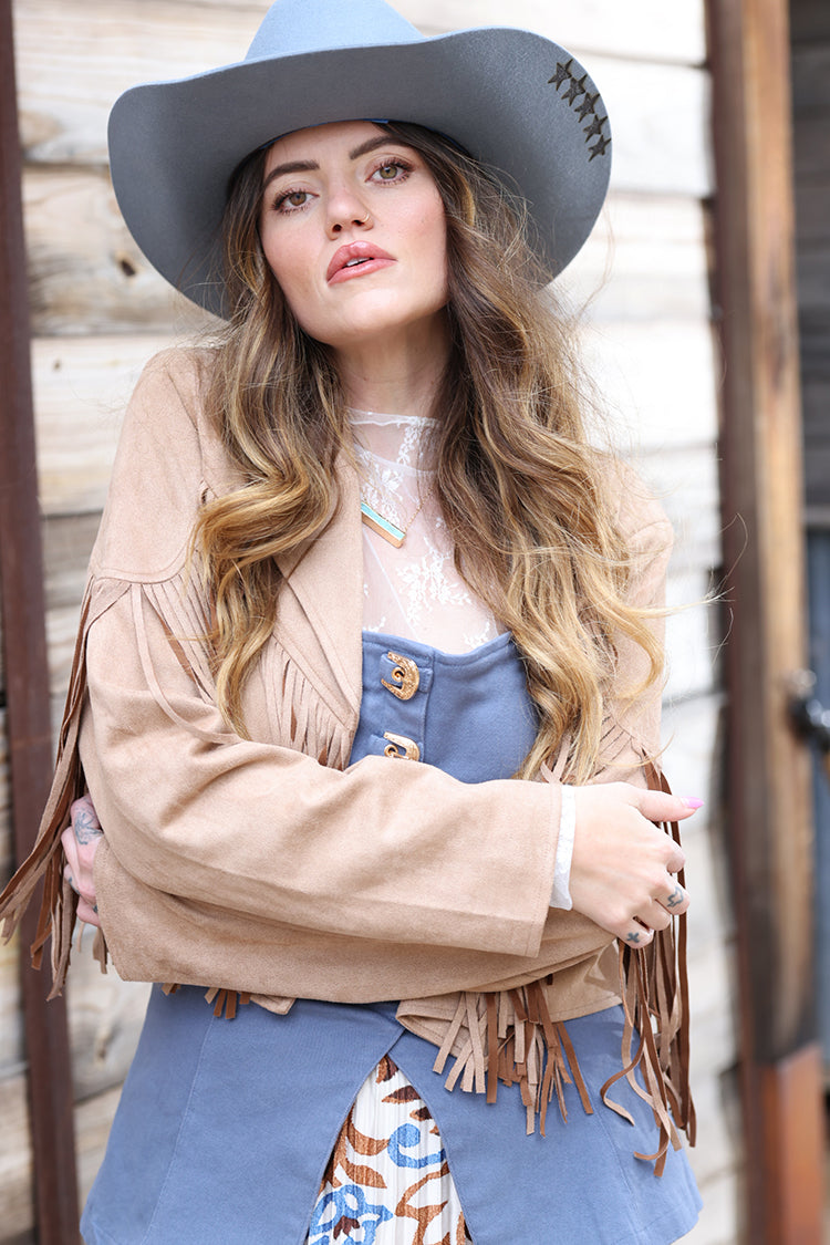 This tan suede jacket brings instant Western-inspired edge with soft texture and eye-catching fringe that moves with you. Designed with a cropped, moto-style silhouette, it layers easily while adding just the right amount of statement to any look. Perfect for concerts, rodeos and nights out, it pairs effortlessly with dresses, denim or cowboy hats.